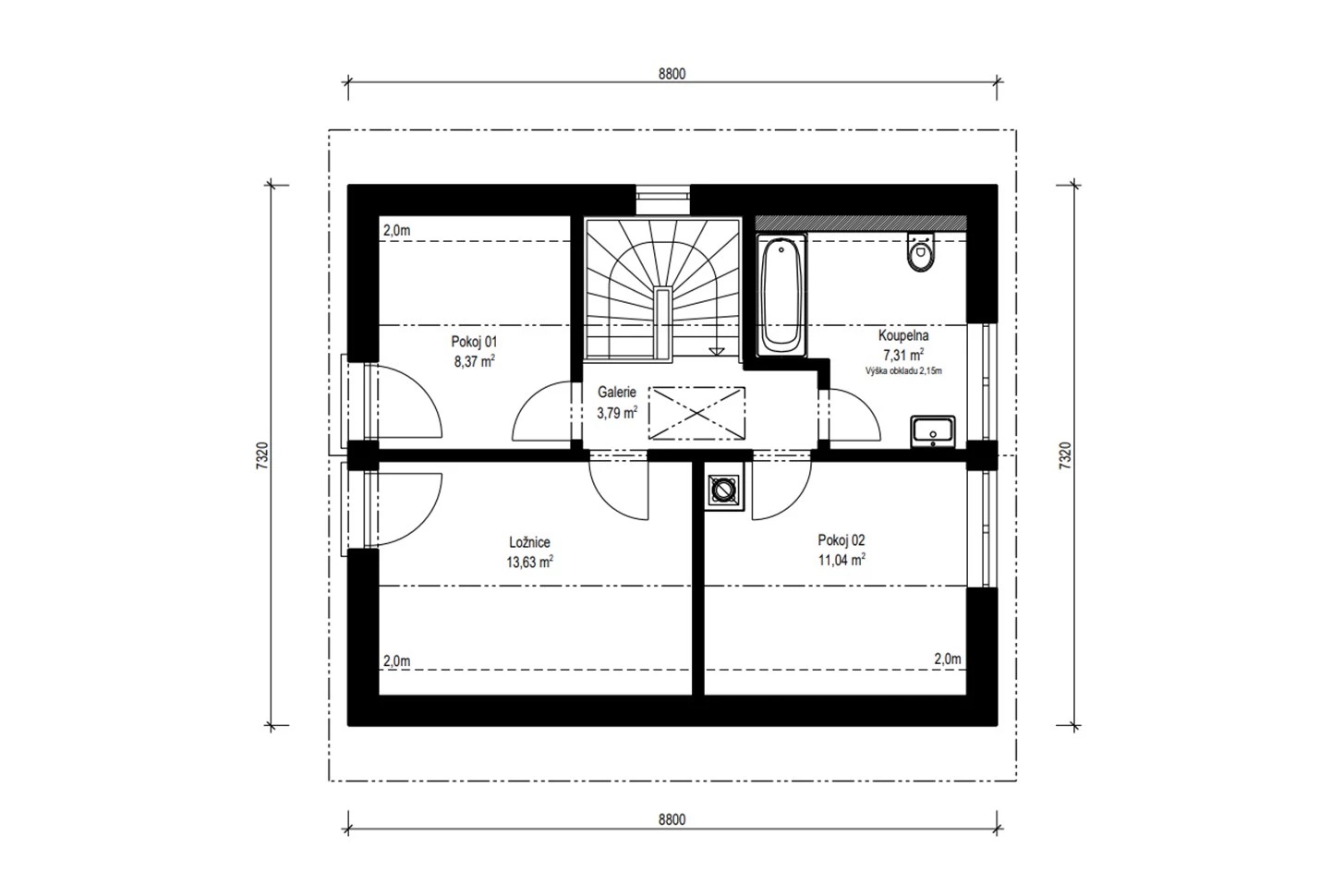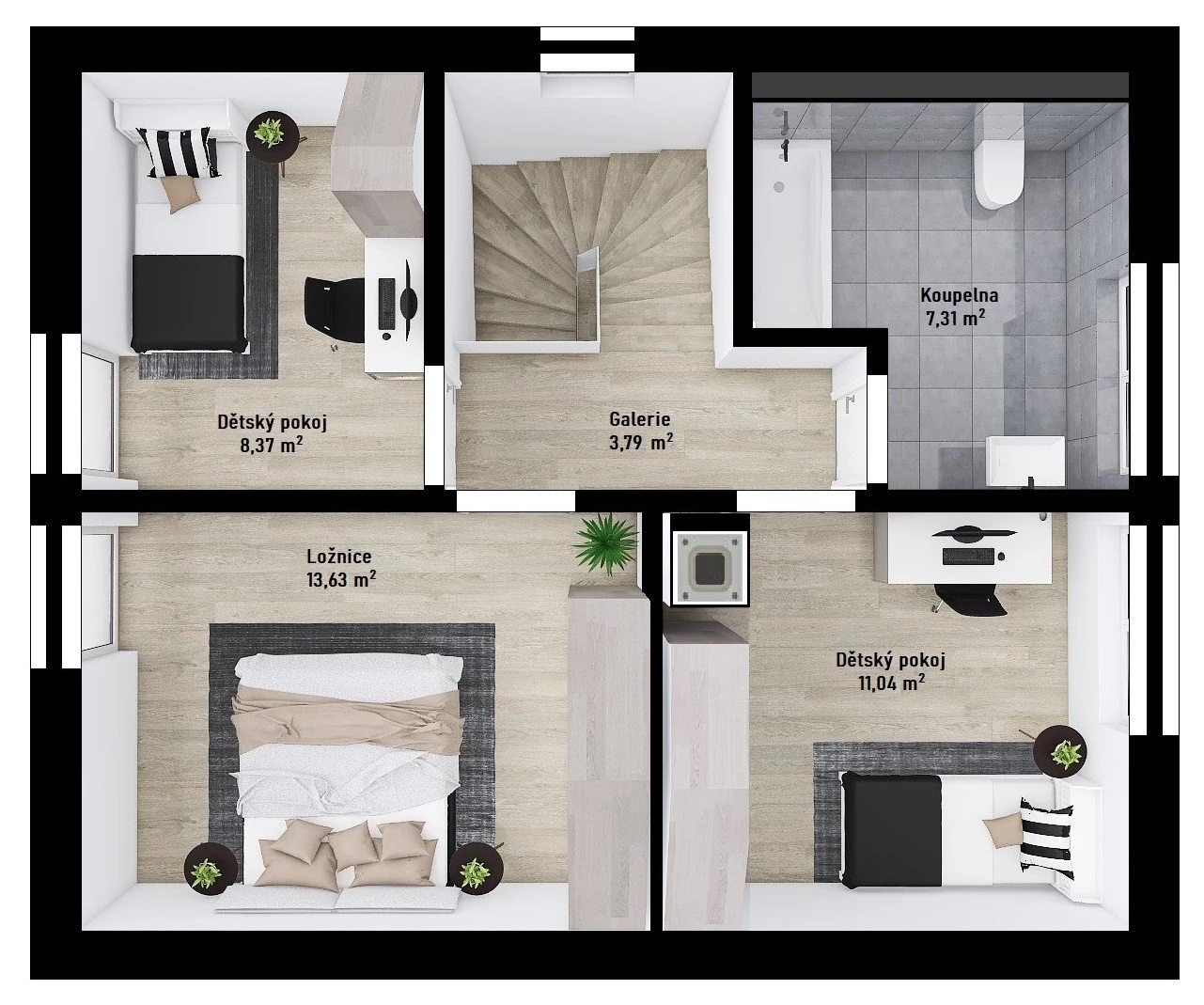 V podkroví najdeme ložnici rodičů a 2 dětské pokoje. Příslušenství doplňuje koupelna s vanou.