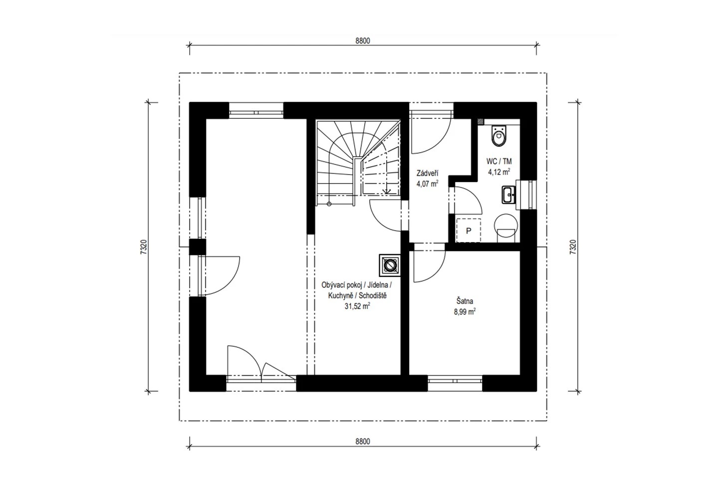 V přízemí je dále umístěna technická místnost s toaletou a prostorná šatna.