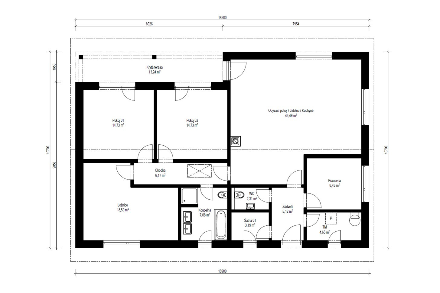 Cena včetně DPH. Cena dále zahrnuje komínový systém, tepelné čerpadlo, podlahové vytápění, centrální rekuperaci vzduchu, dřevěná nebo plasthliníková okna.