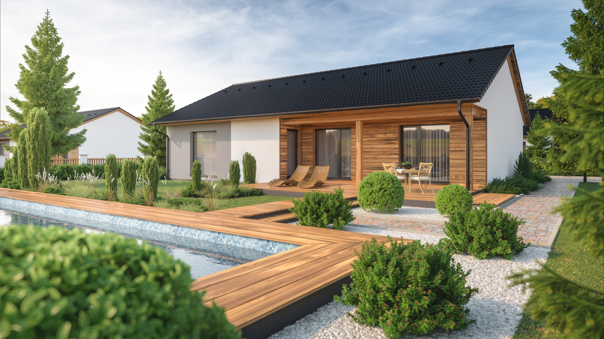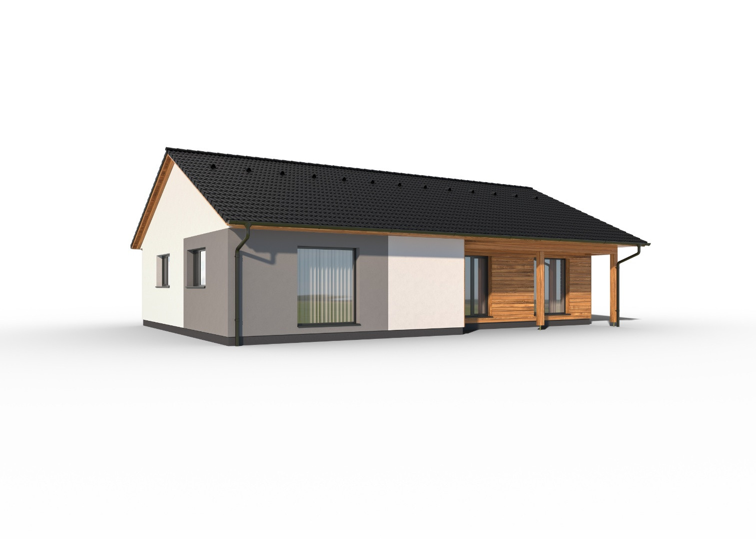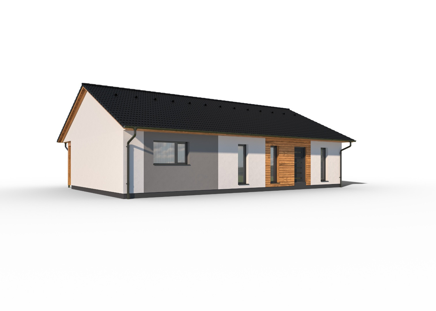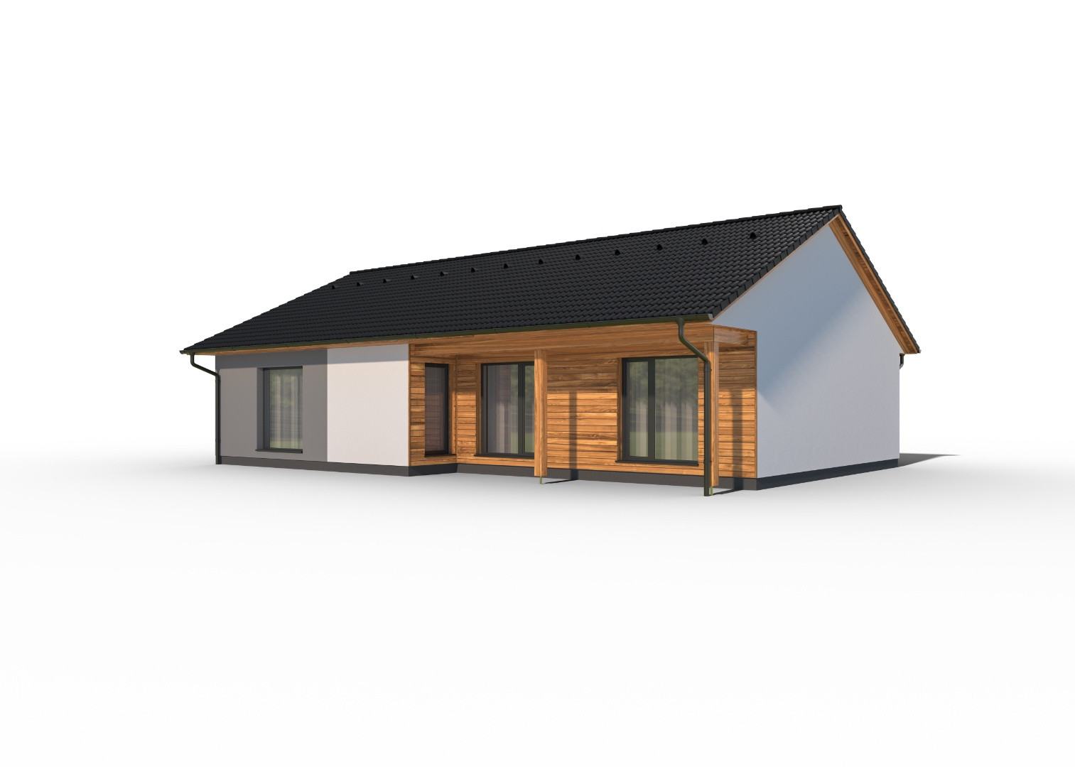 Jednoduchý rodinný dům typu bungalov se sedlovou střechou. Moderní vzhled domu zajišťuje dřevěný obklad na části fasády. Praktickým prvkem je terasa chráněná přesahem střechy.