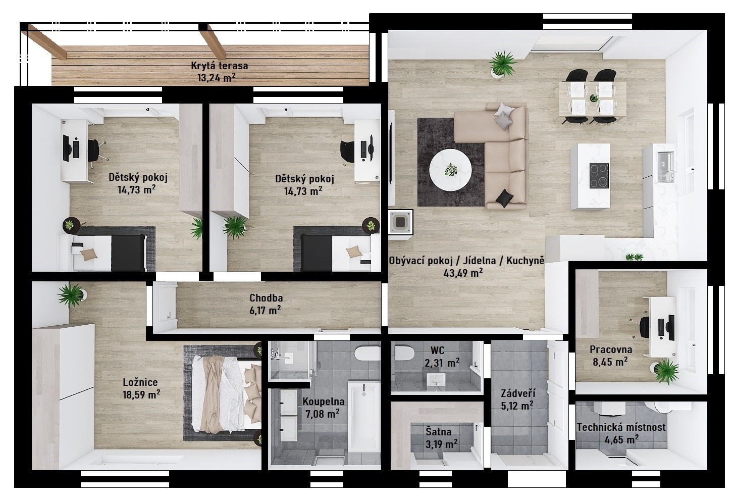 Privátní zóna je tvořena ložnicí rodičů, 2 dětskými pokoji a koupelnou s vanou i sprchovým koutem.