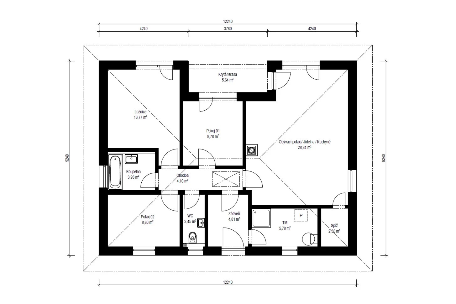 Obývací prostor je propojený s jídelnou a kuchyní, kde je navržena praktická spíž. Francouzská okna zajišťují dokonalé prosvětlení interiéru a jeho propojení s krytou terasou. Pro navození útulné atmosféry nechybí ani krb.