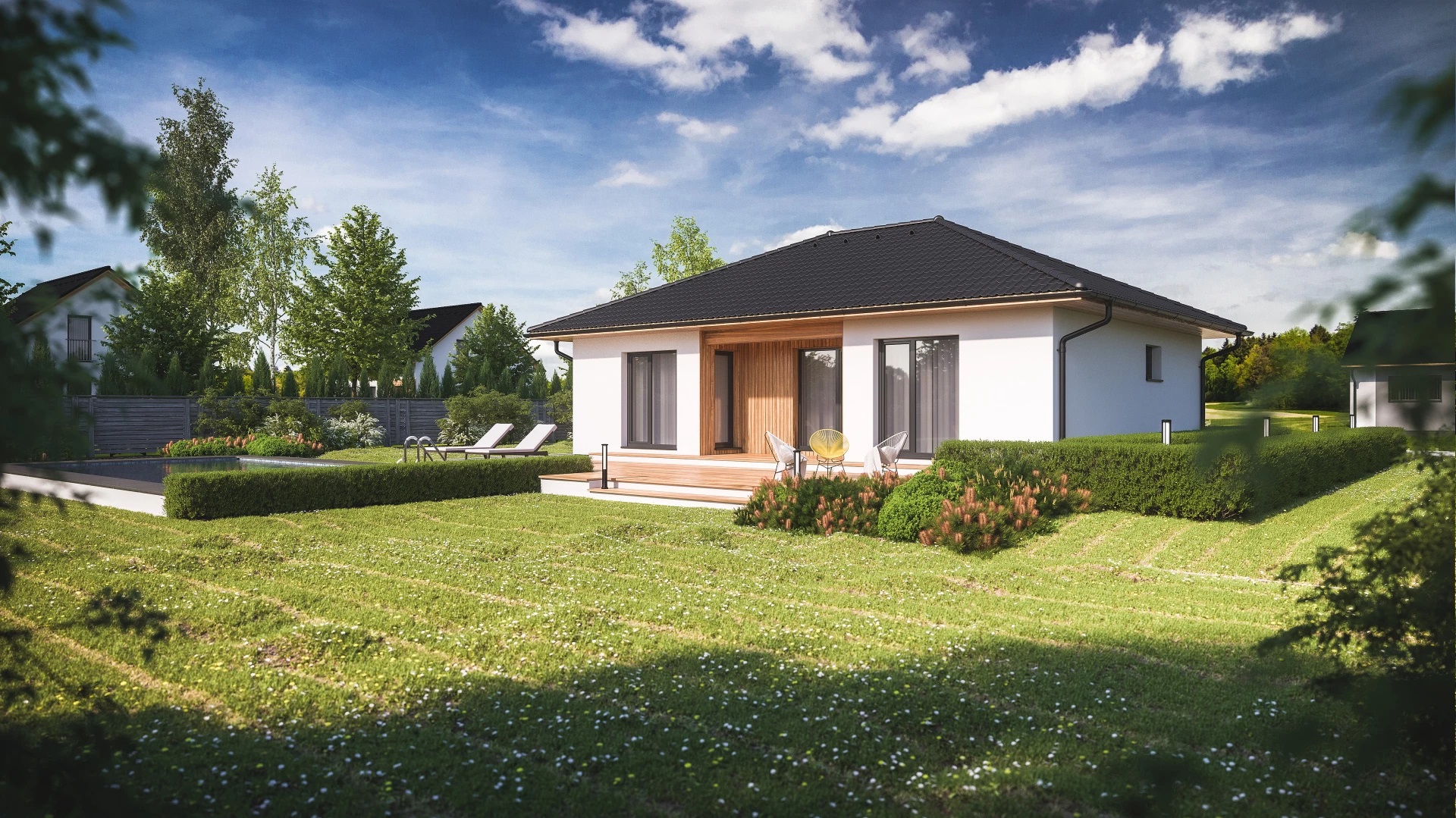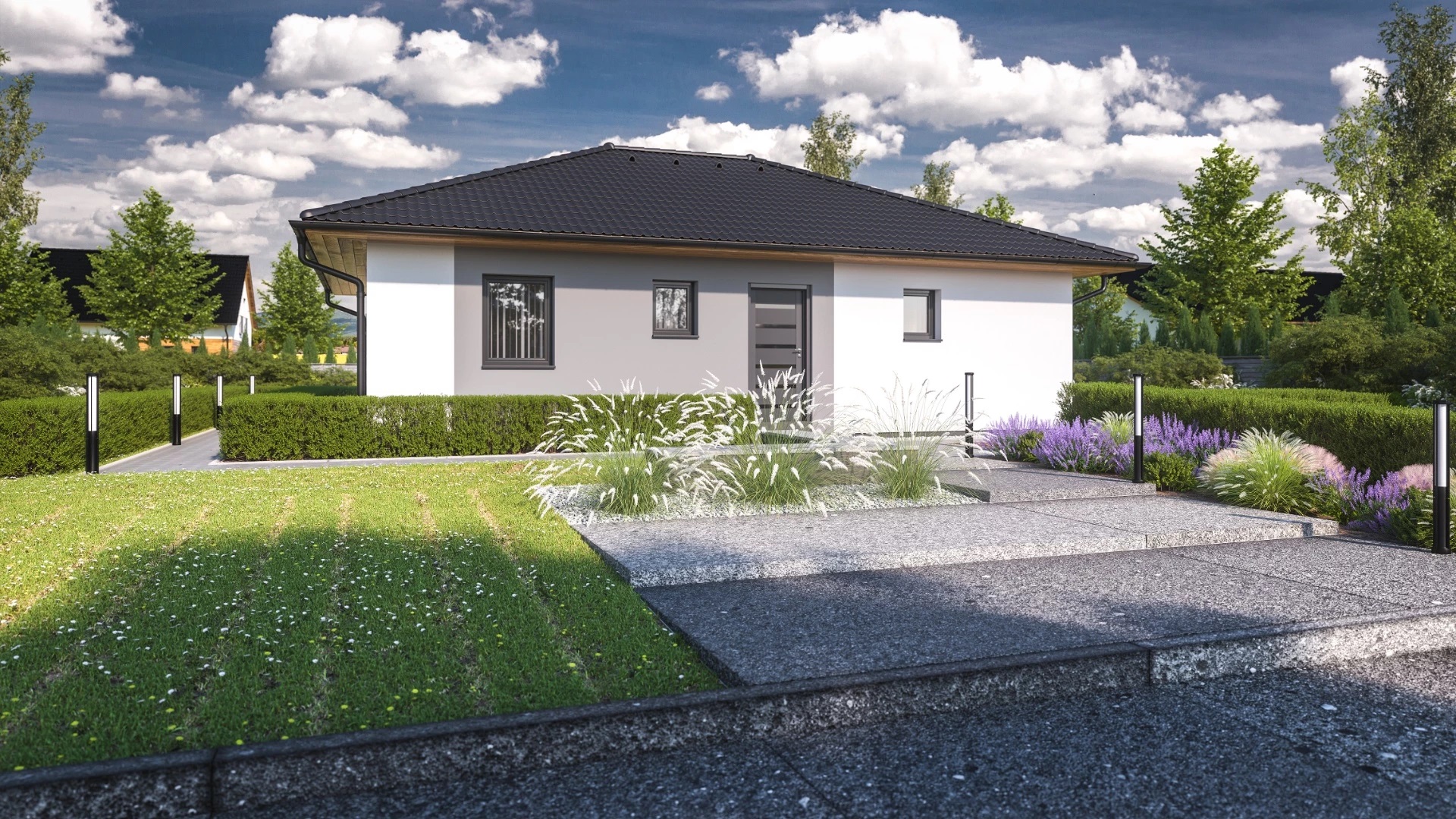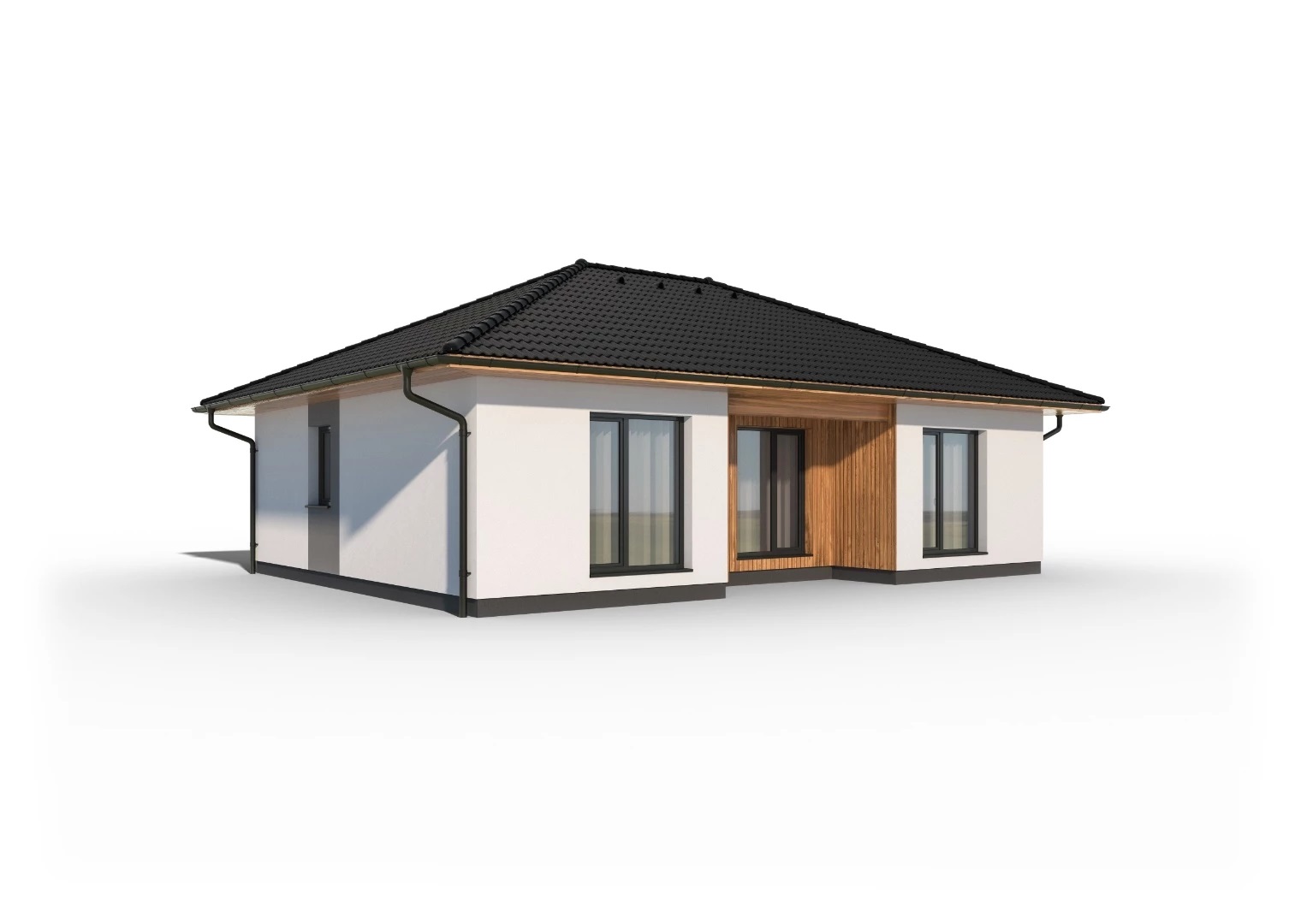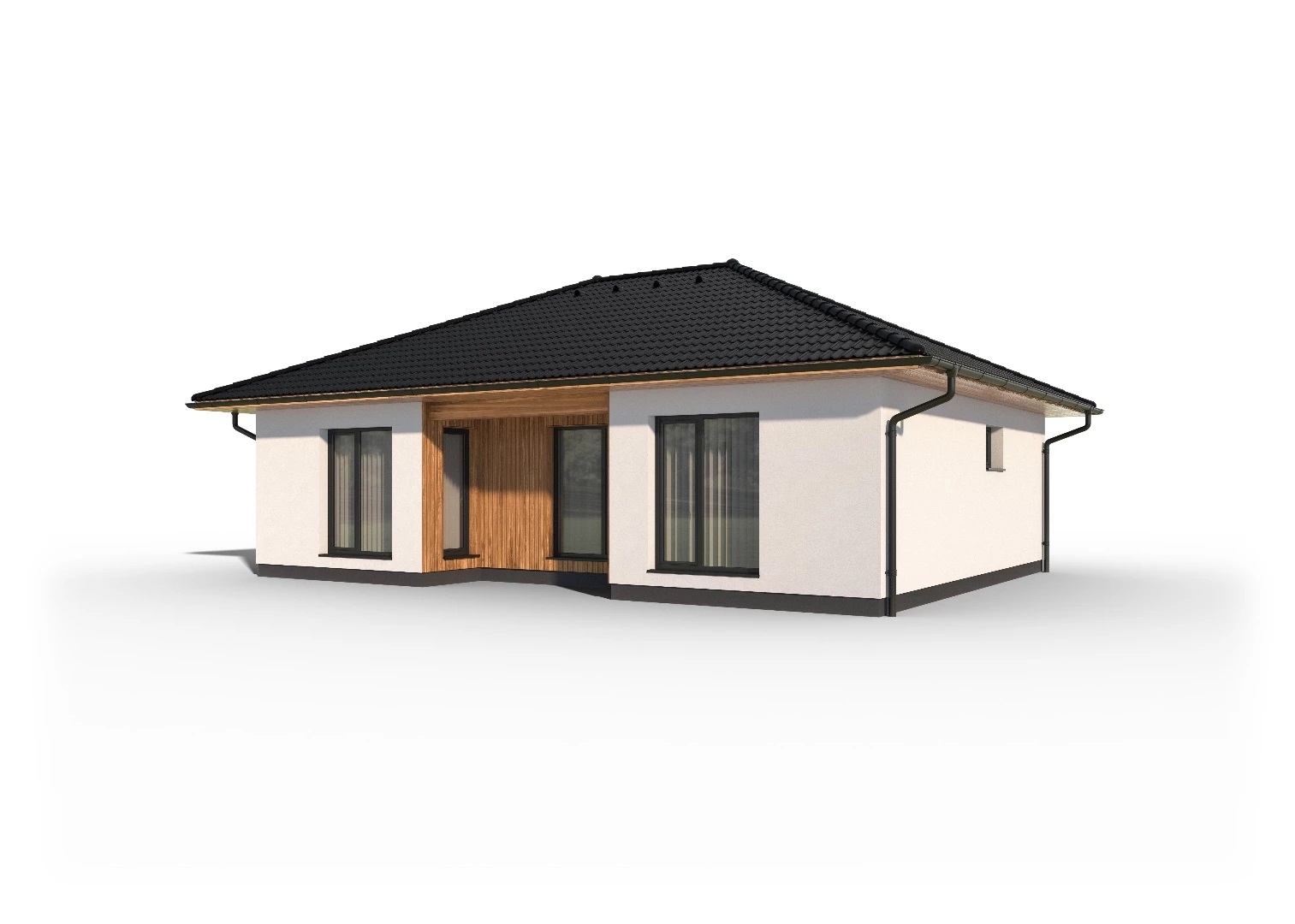 Kompaktní, 4pokojový bungalov s efektivně využitým půdorysem s malým podílem chodeb. Praktickým prvkem domu je terasa zapuštěná do hmoty domu a překrytá přesahem střechy.
