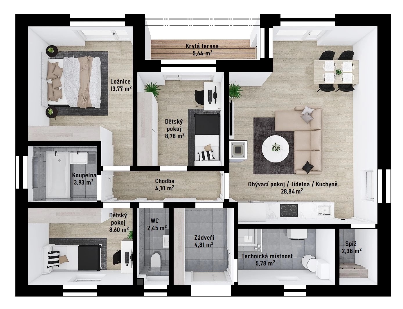 Ve všech pokojích a v zádveří je navržen prostor pro instalaci vestavěných skříní.