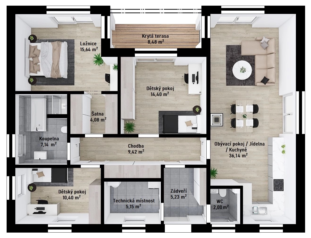 V domě je dále navržena ložnice rodičů s vlastní šatnou a výstupem na terasu a 2 dětské pokoje. Nadstandardně velká koupelna nabízí vanu i sprchový kout.