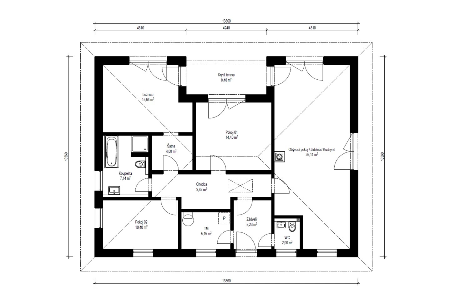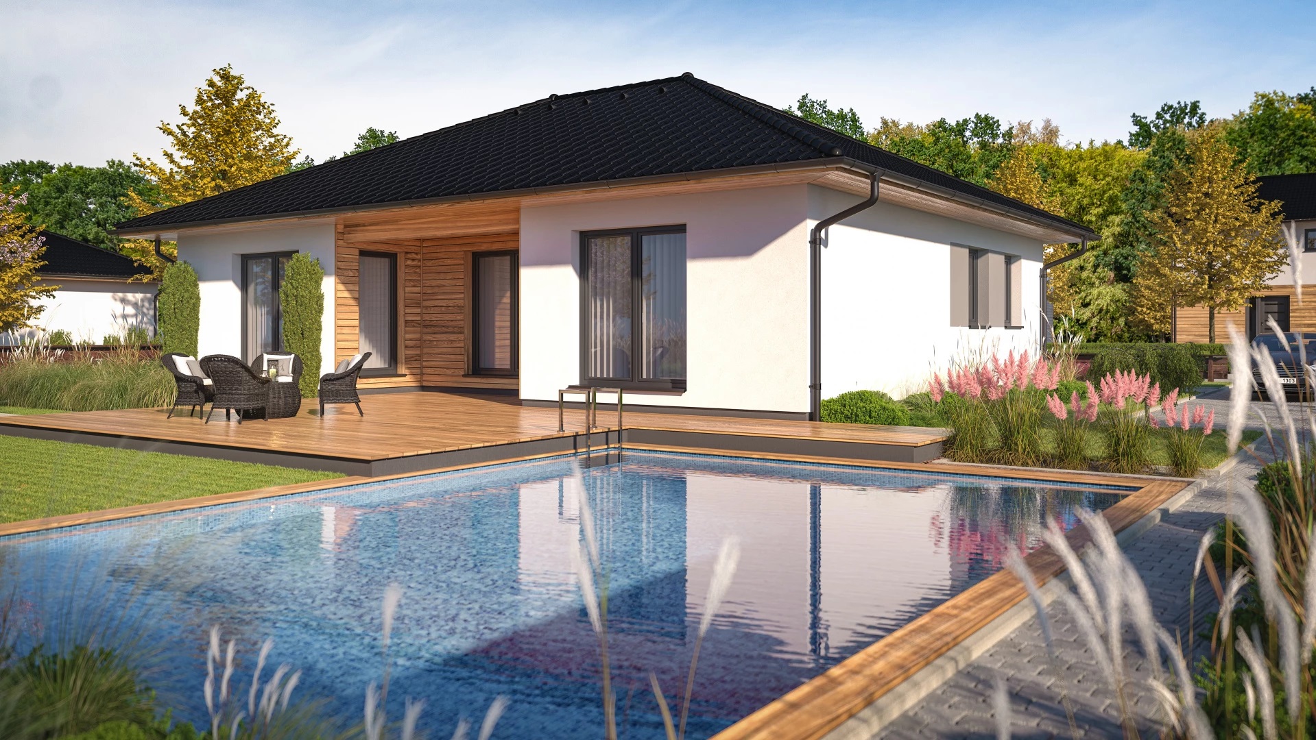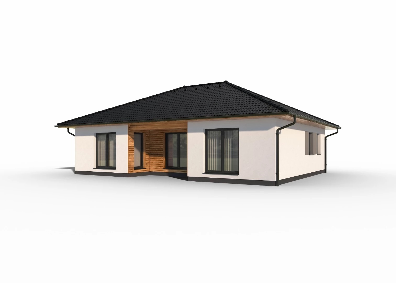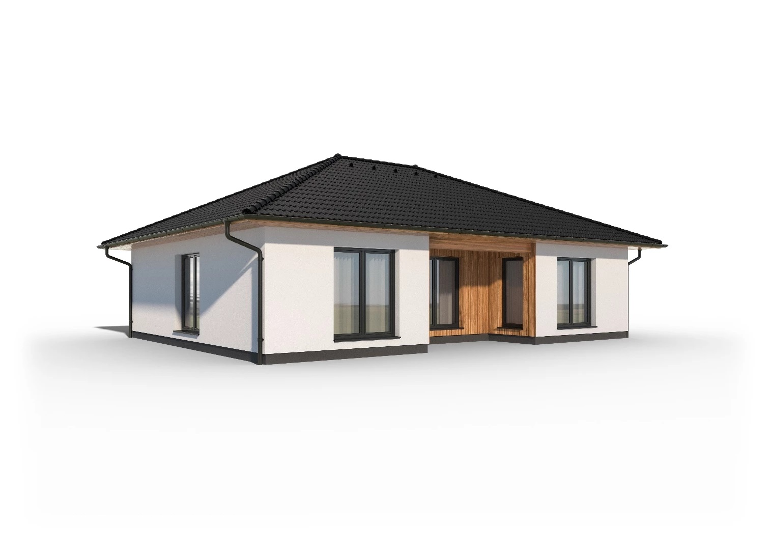 Kompaktní, 4pokojový bungalov, ideální pro pohodlné bydlení 4-5členné rodiny. Praktickým prvkem domu je terasa zapuštěná do hmoty domu a překrytá přesahem střechy.