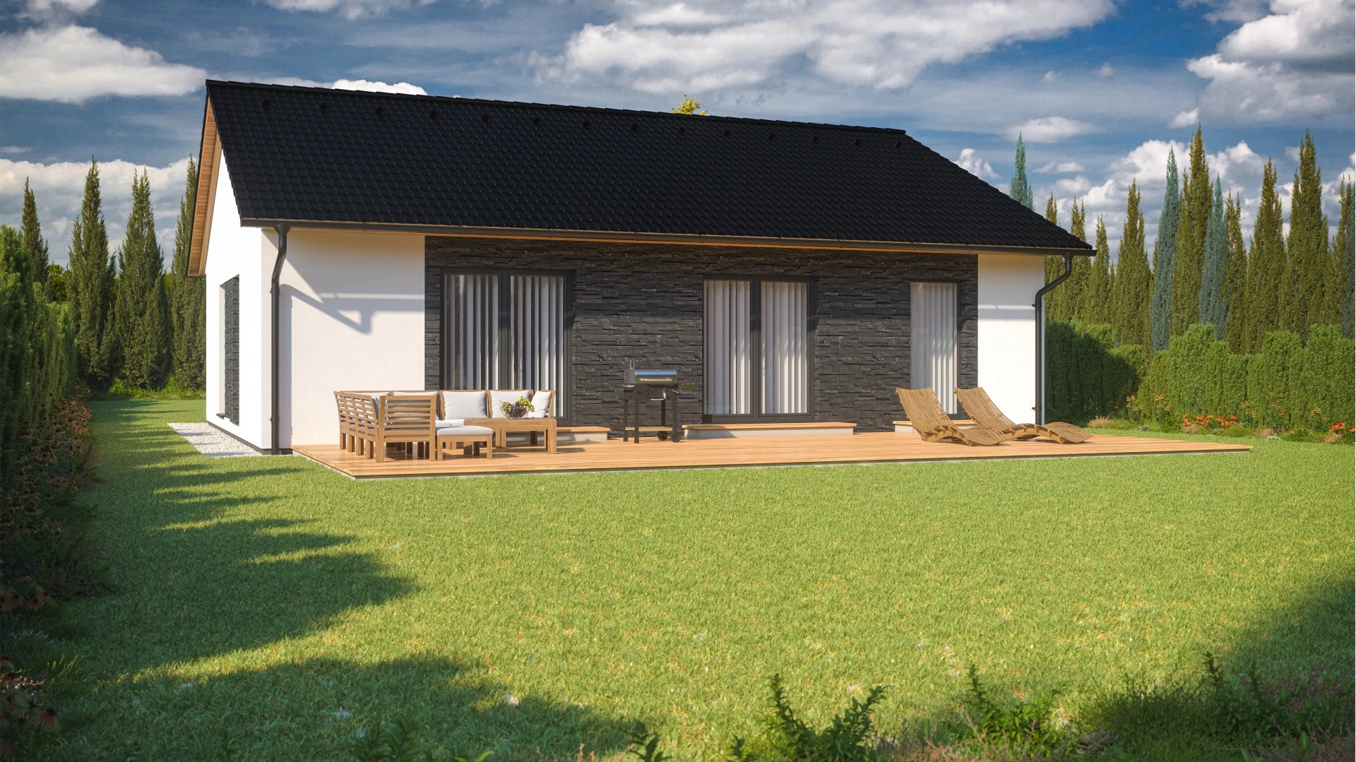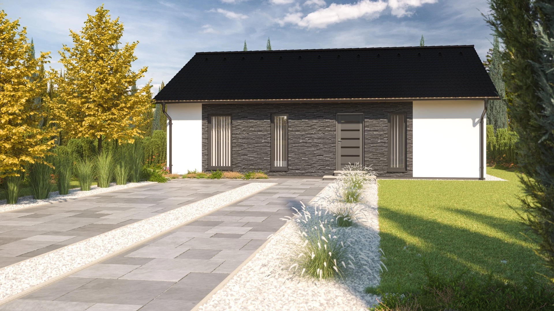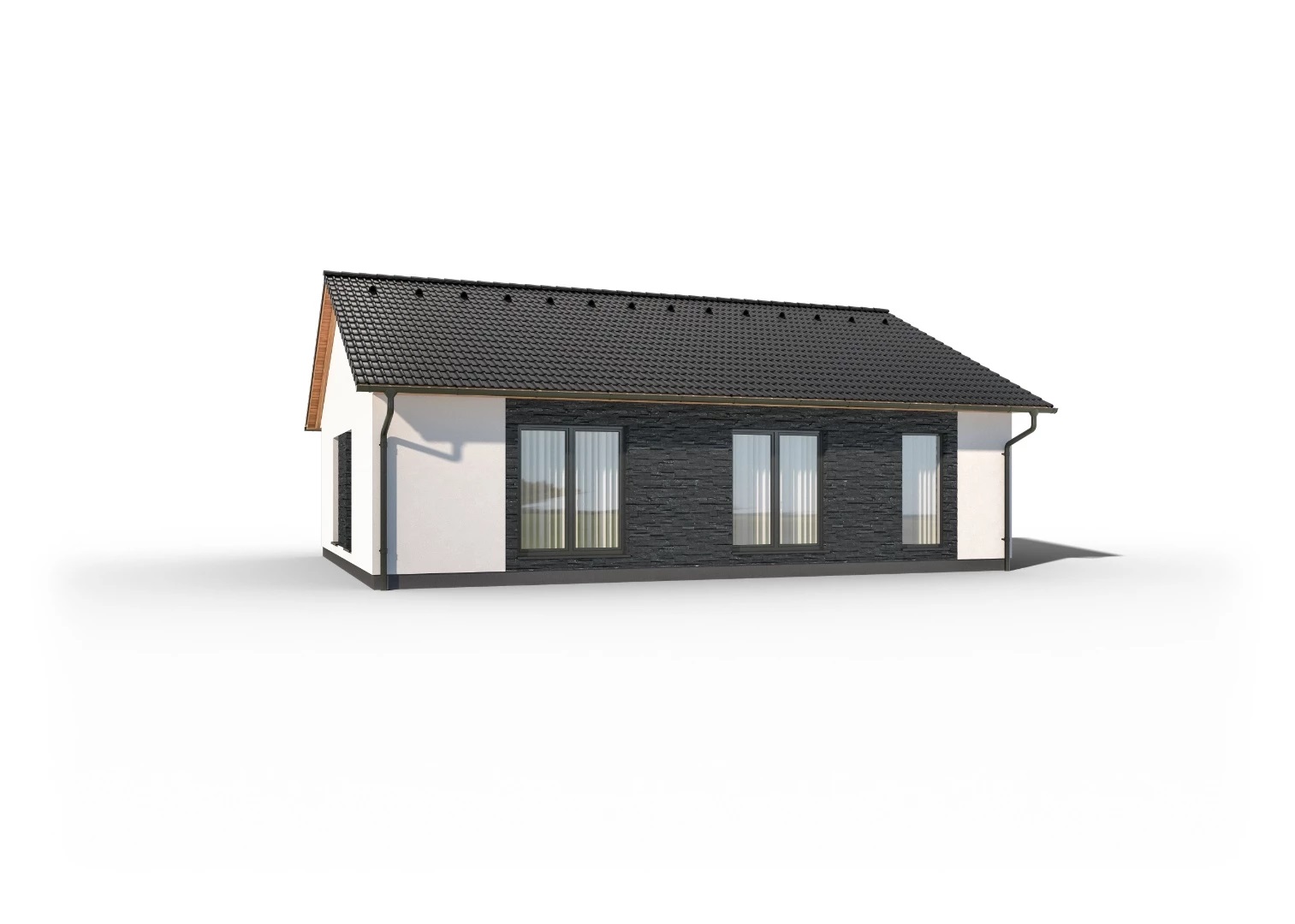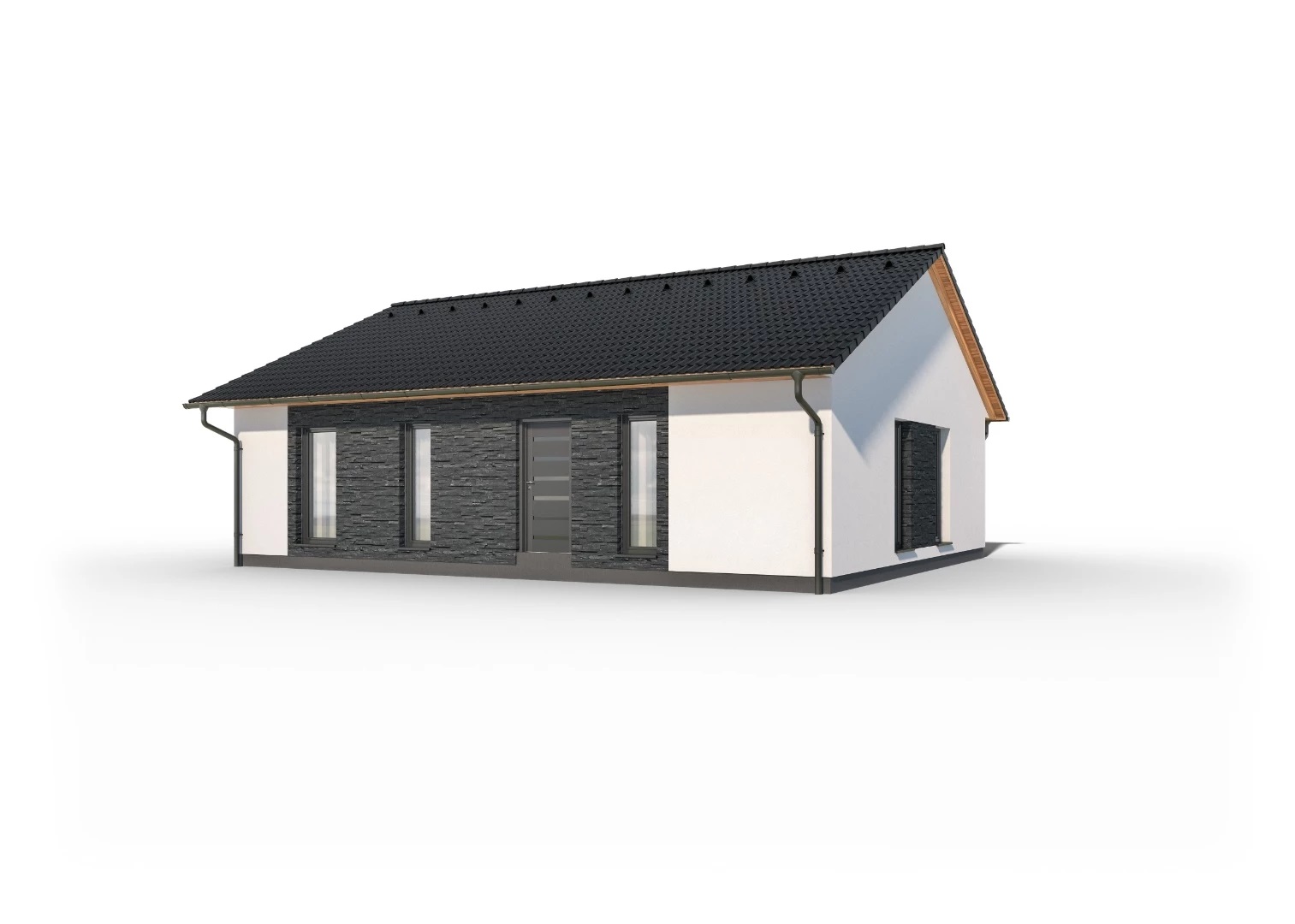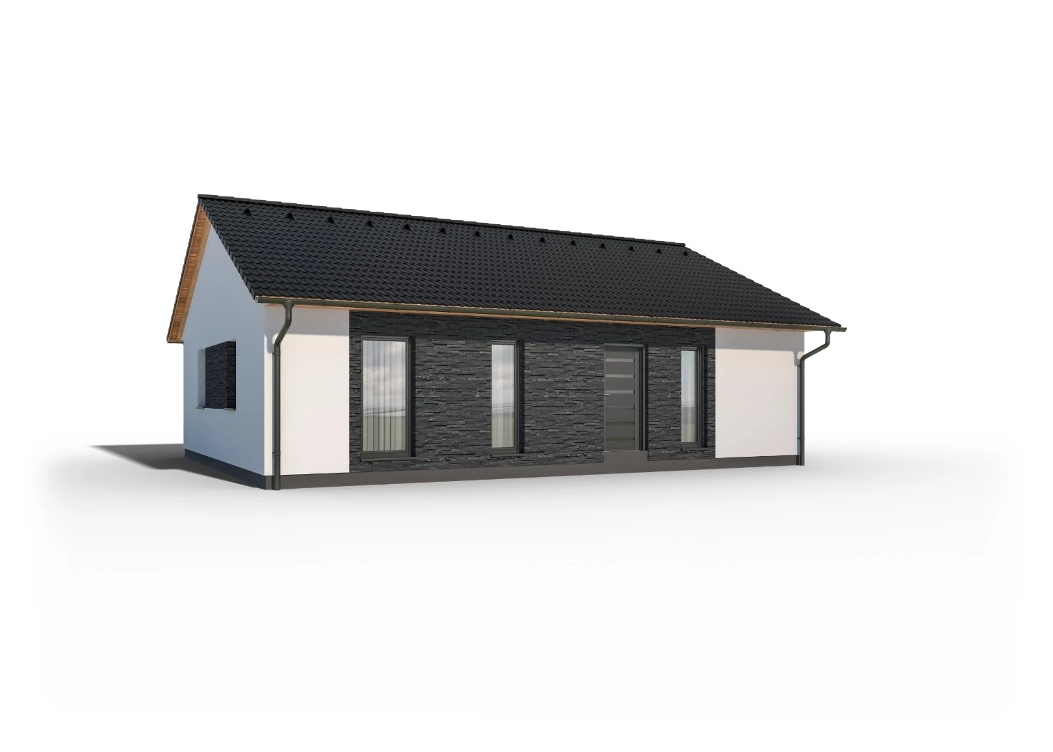 Kompaktní, jednoduchý, 4pokojový bungalov klasického tvaru se sedlovou střechou. Kamenný obklad na části fasády dodává domu atraktivní vzhled.