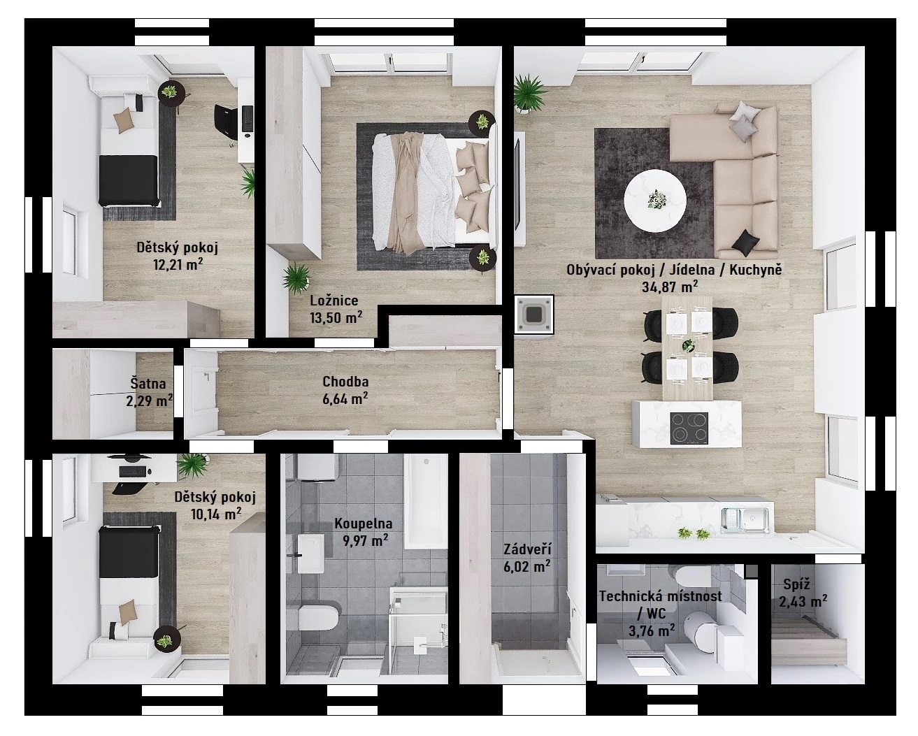 Cena včetně DPH. Cena dále zahrnuje komínový systém, tepelné čerpadlo, podlahové vytápění, centrální rekuperaci vzduchu, dřevěná nebo plasthliníková okna.