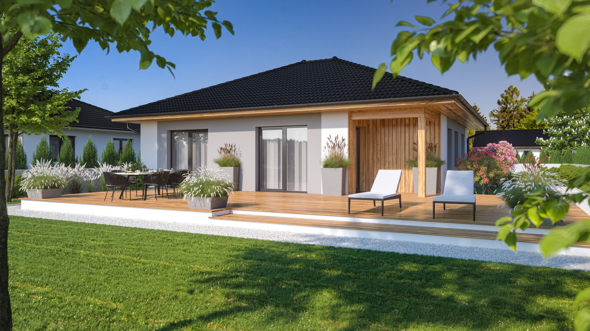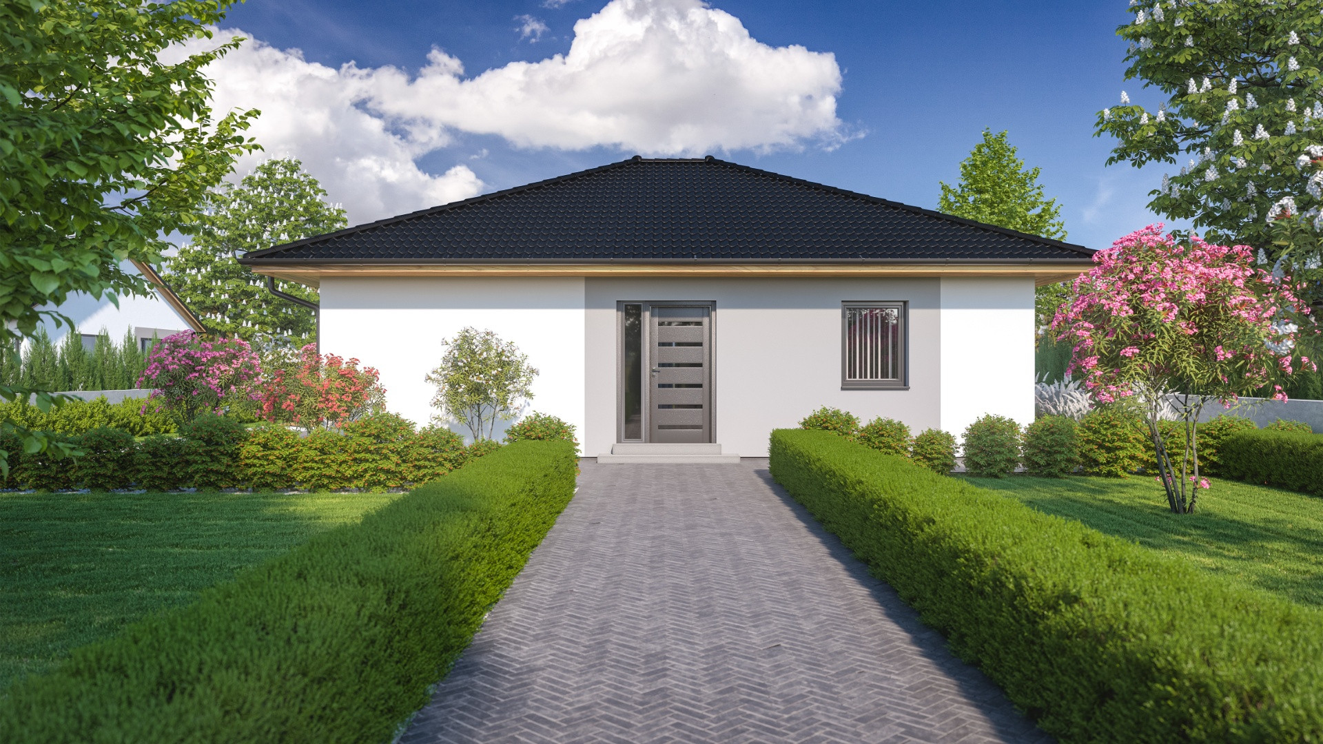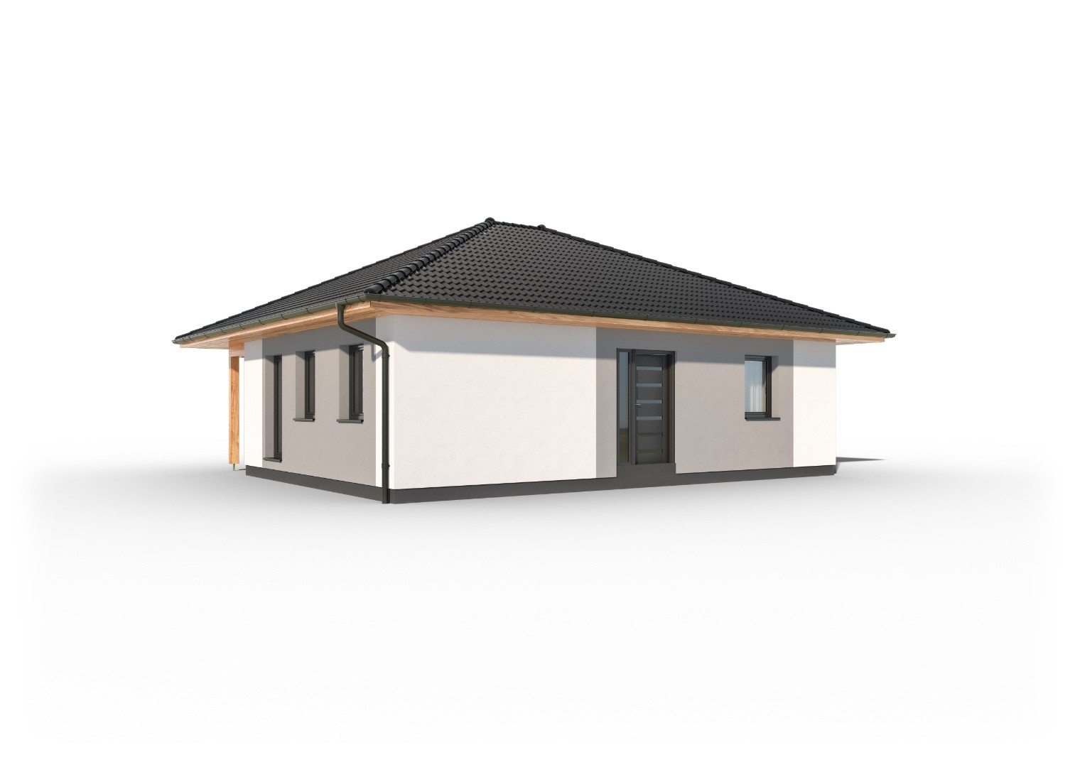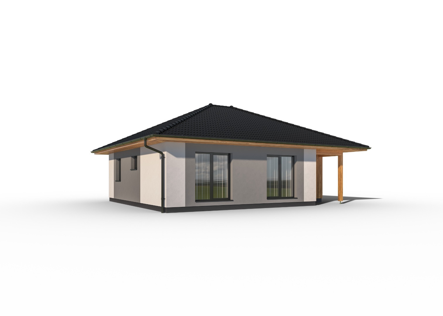 Jednoduchý, kompaktní rodinný dům typu bungalov s malou zastavěnou plochou. Praktickým prvkem je terasa překrytá přesahem střechy. Dům je vhodný pro 3-4člennou rodinu.