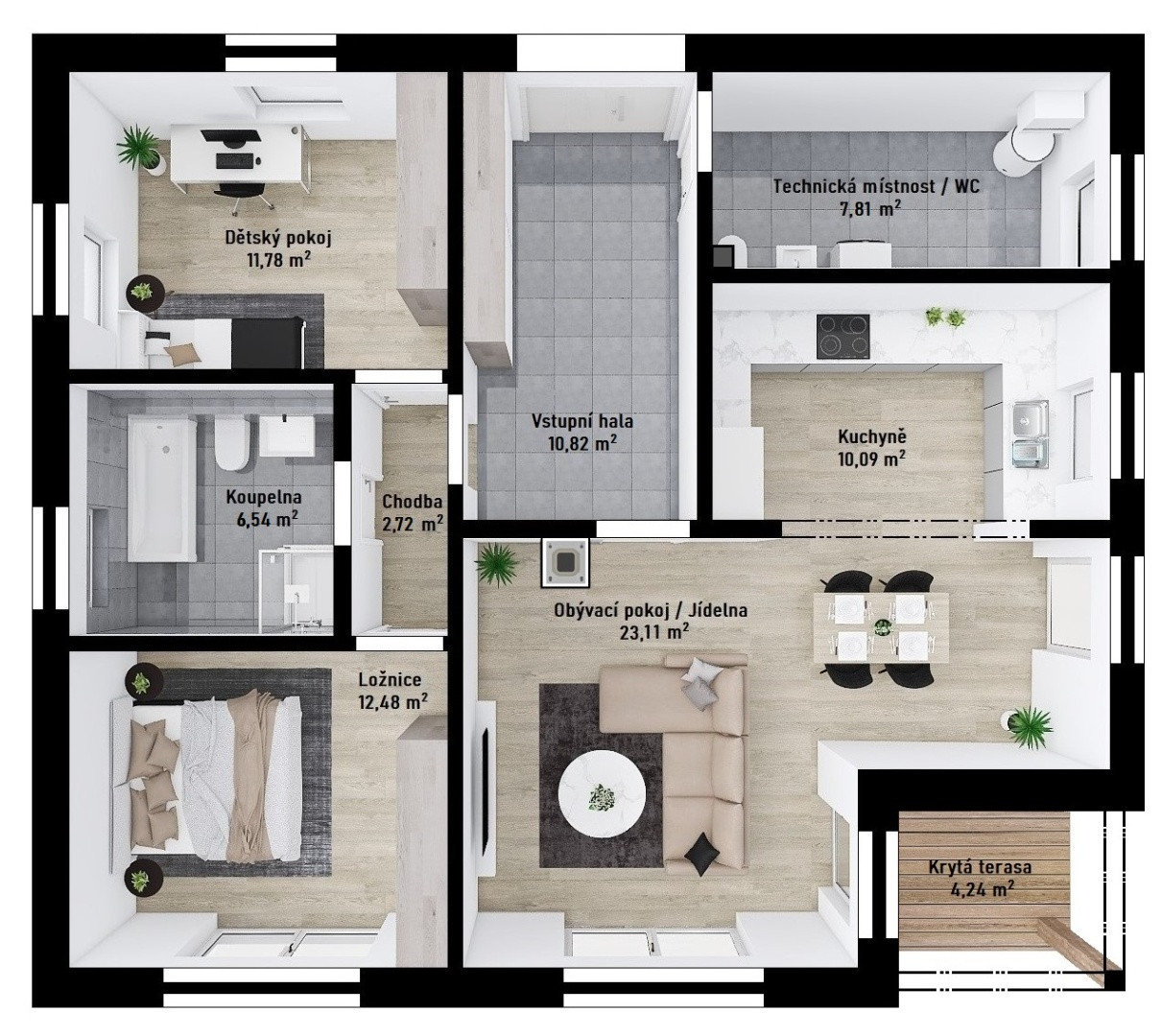 V privátní zóně najdeme prostornou koupelnu s vanou a sprchovým koutem, dětský pokoj a ložnici rodičů s výstupem na terasu.