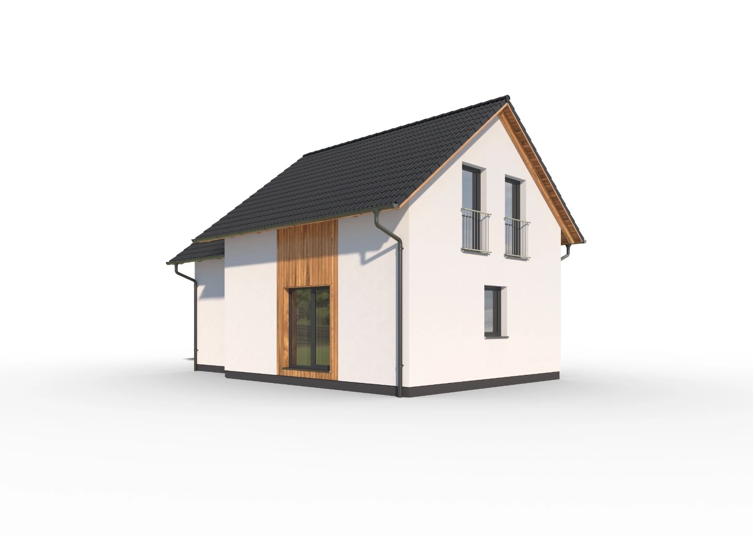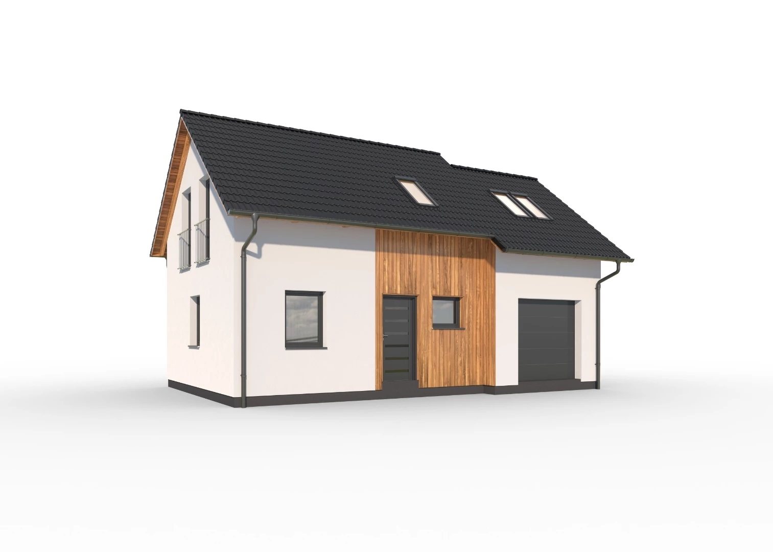Kompaktní, 4pokojový rodinný dům se sedlovou střechou a obytným podkrovím. Součástí domu je garáž. Dům je ideální pro pohodlné bydlení rodiny se 2-3 dětmi. Použití dřevěného obkladu na části fasády dodává domu moderní vzhled.