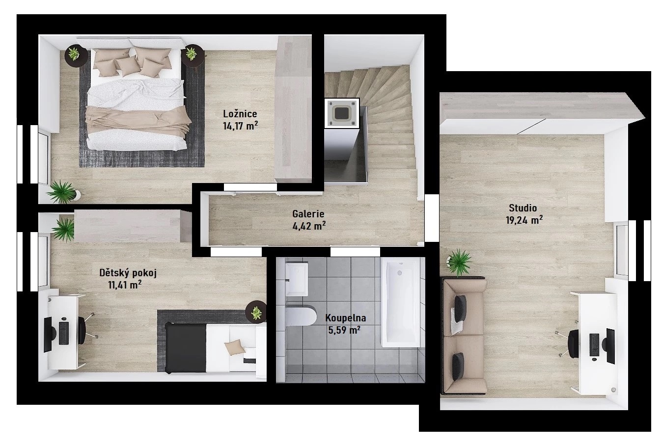 V patře jsou umístěny 3 pohodlné ložnice s prostorem pro vestavěné skříně a koupelna s vanou.