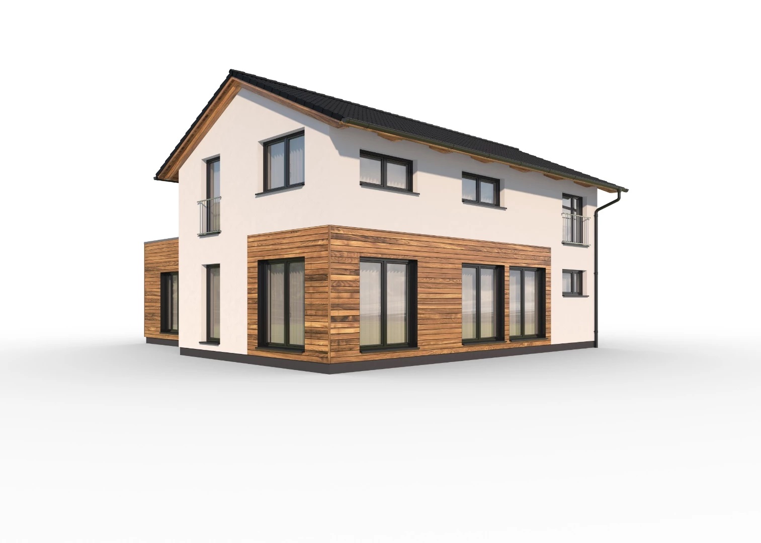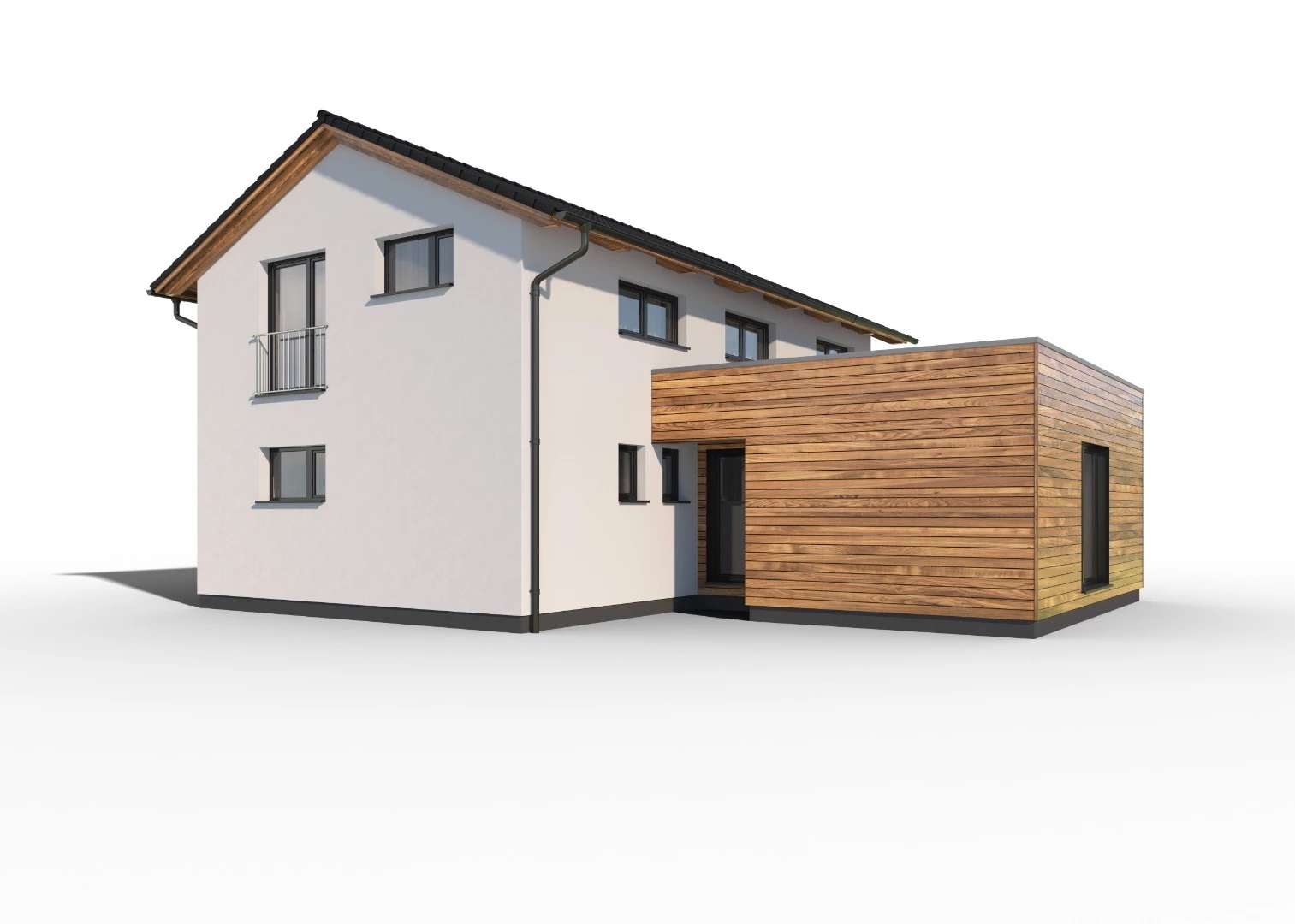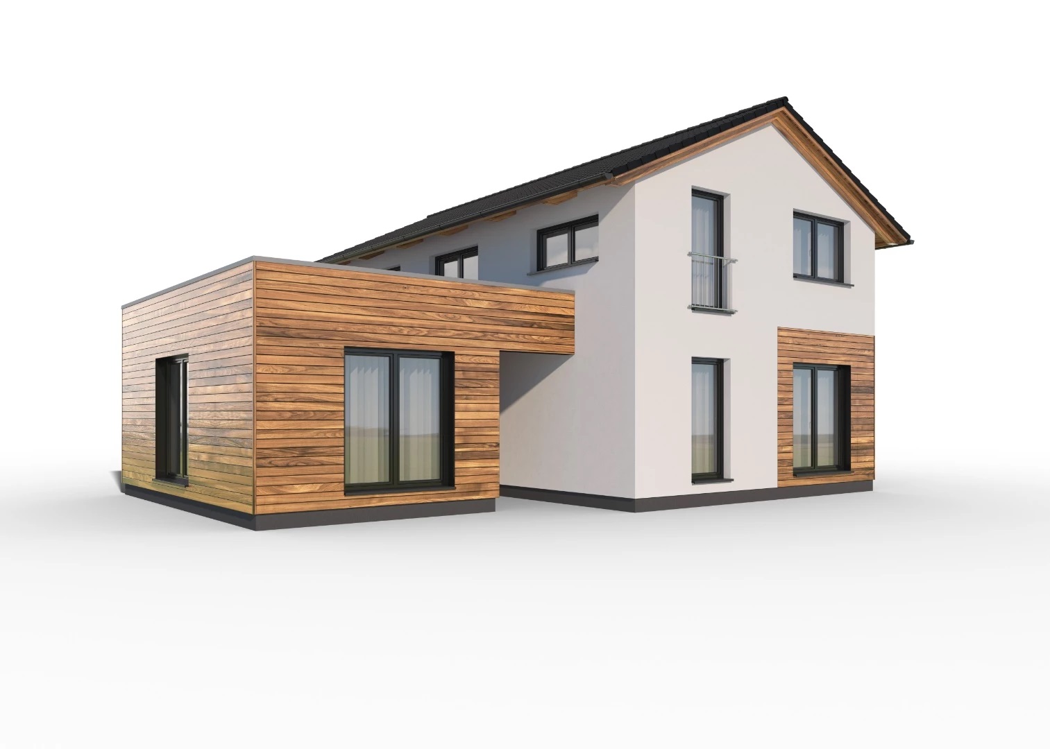 Moderní, 5pokojový, dvoupodlažní rodinný dům s kombinací ploché a sedlové střechy, vhodný pro pohodlné bydlení velké rodiny. Dřevěný obklad na fasádě opticky odděluje jednotlivé hmoty a dodává domu atraktivní vzhled.