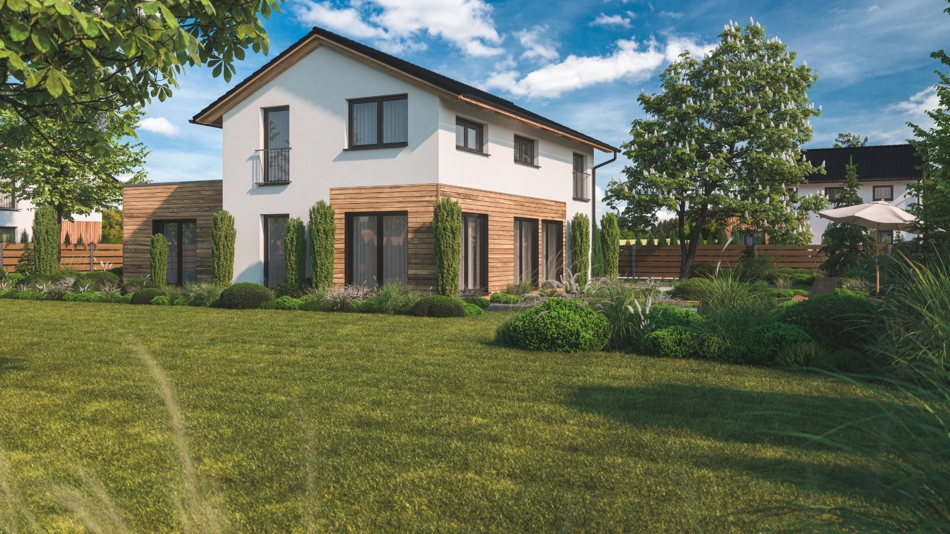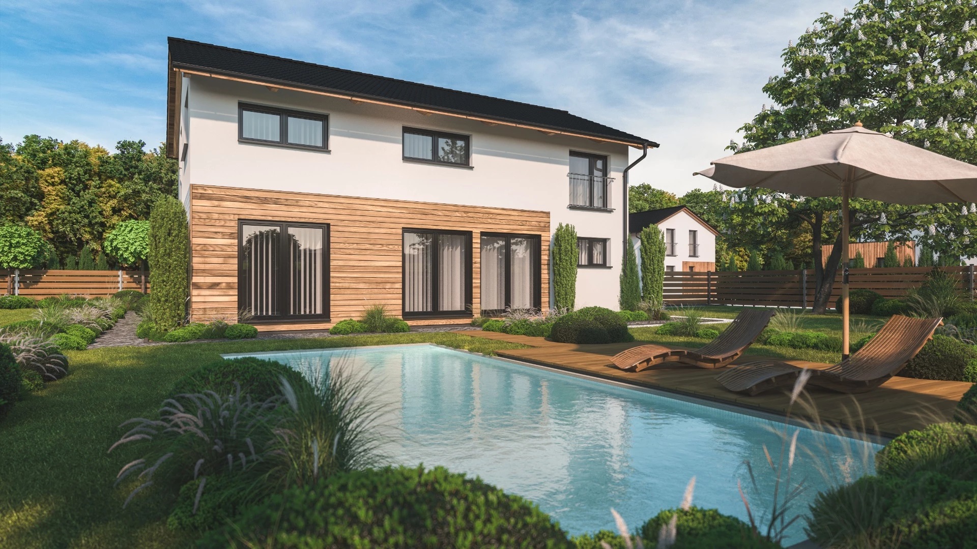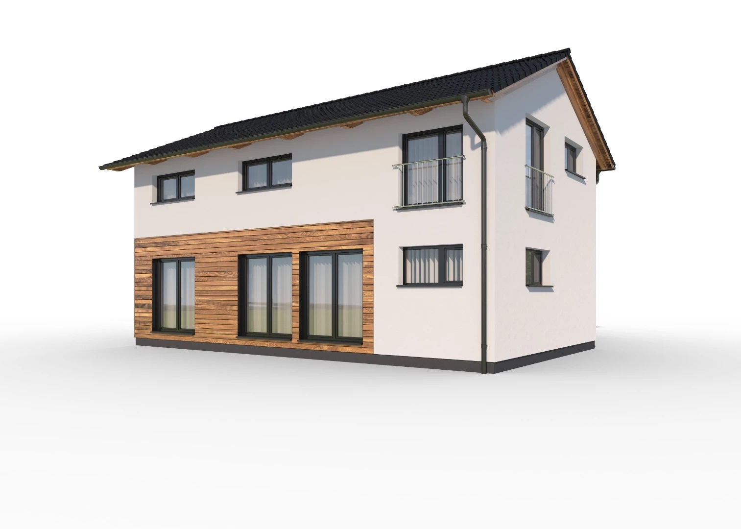 Moderní, 5pokojový, dvoupodlažní rodinný dům s kombinací ploché a sedlové střechy, vhodný pro pohodlné bydlení velké rodiny. Dřevěný obklad na fasádě opticky odděluje jednotlivé hmoty a dodává domu atraktivní vzhled.