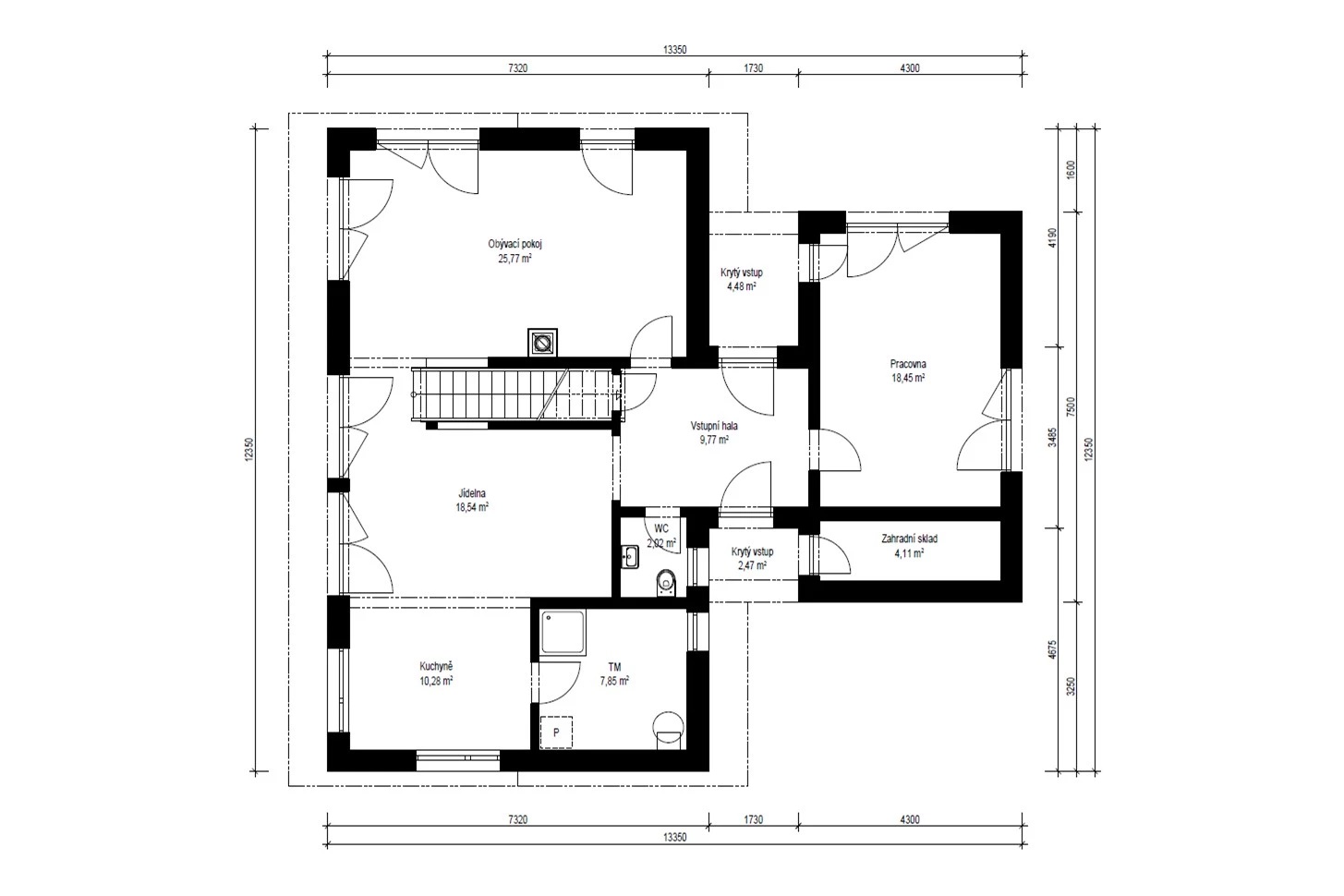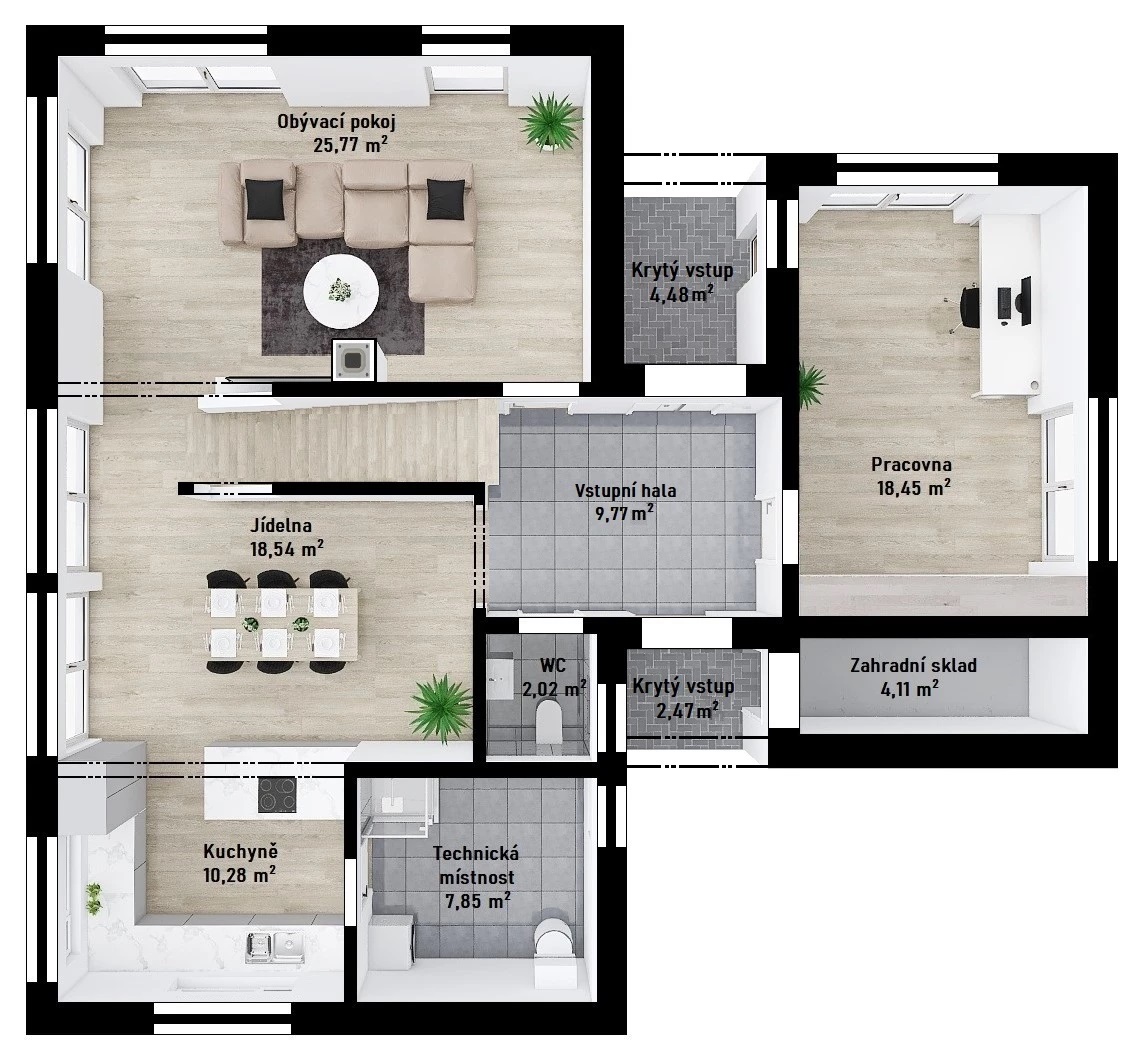 Cena včetně DPH. Cena dále zahrnuje komínový systém, tepelné čerpadlo, podlahové vytápění, centrální rekuperaci vzduchu, dřevěná nebo plasthliníková okna.