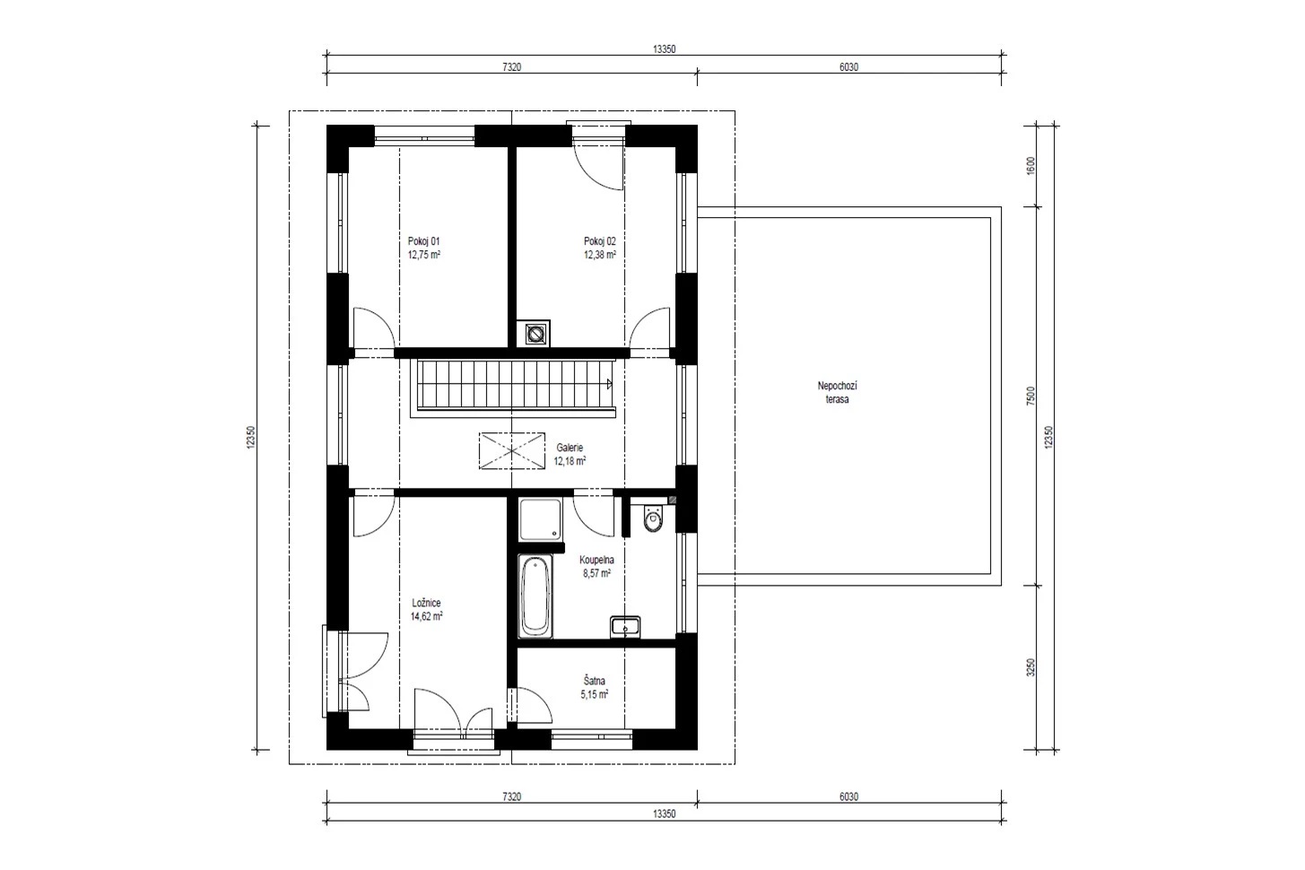 V patře je umístěna prostorná ložnice rodičů s vlastní šatnou, 2 dětské pokoje a nadstandardně velká koupelna s vanou i sprchovým koutem.