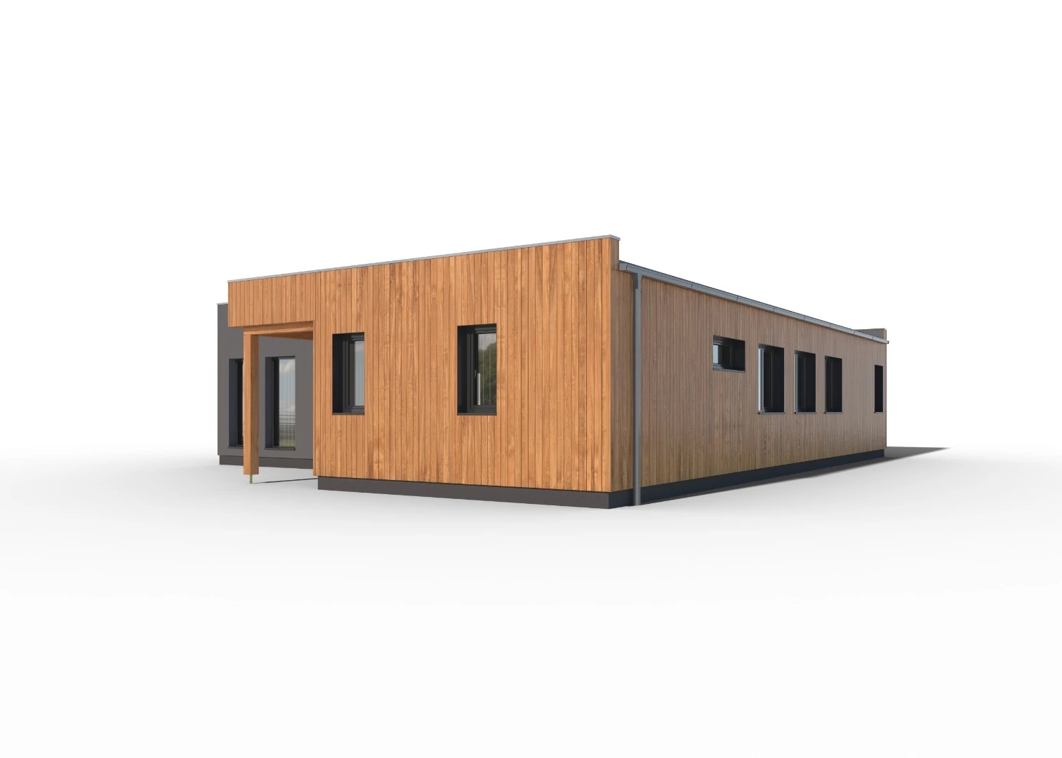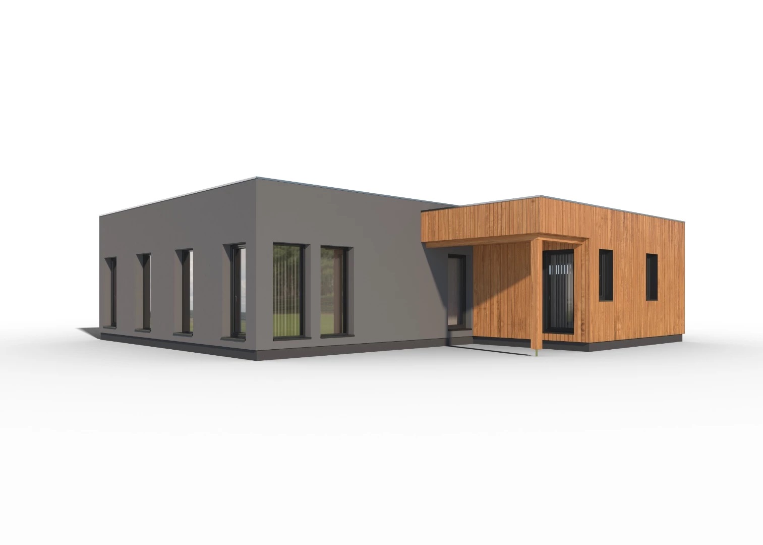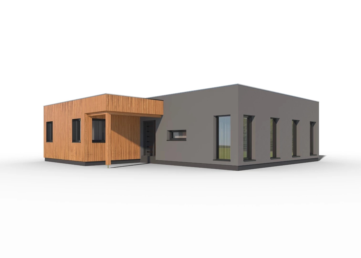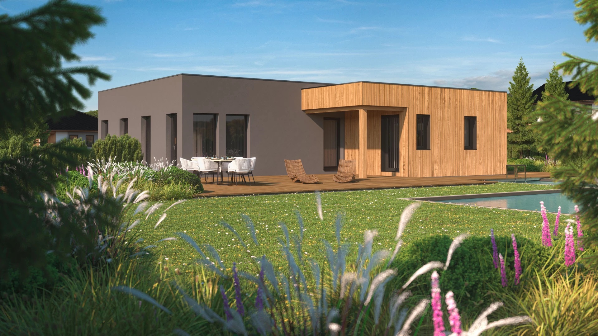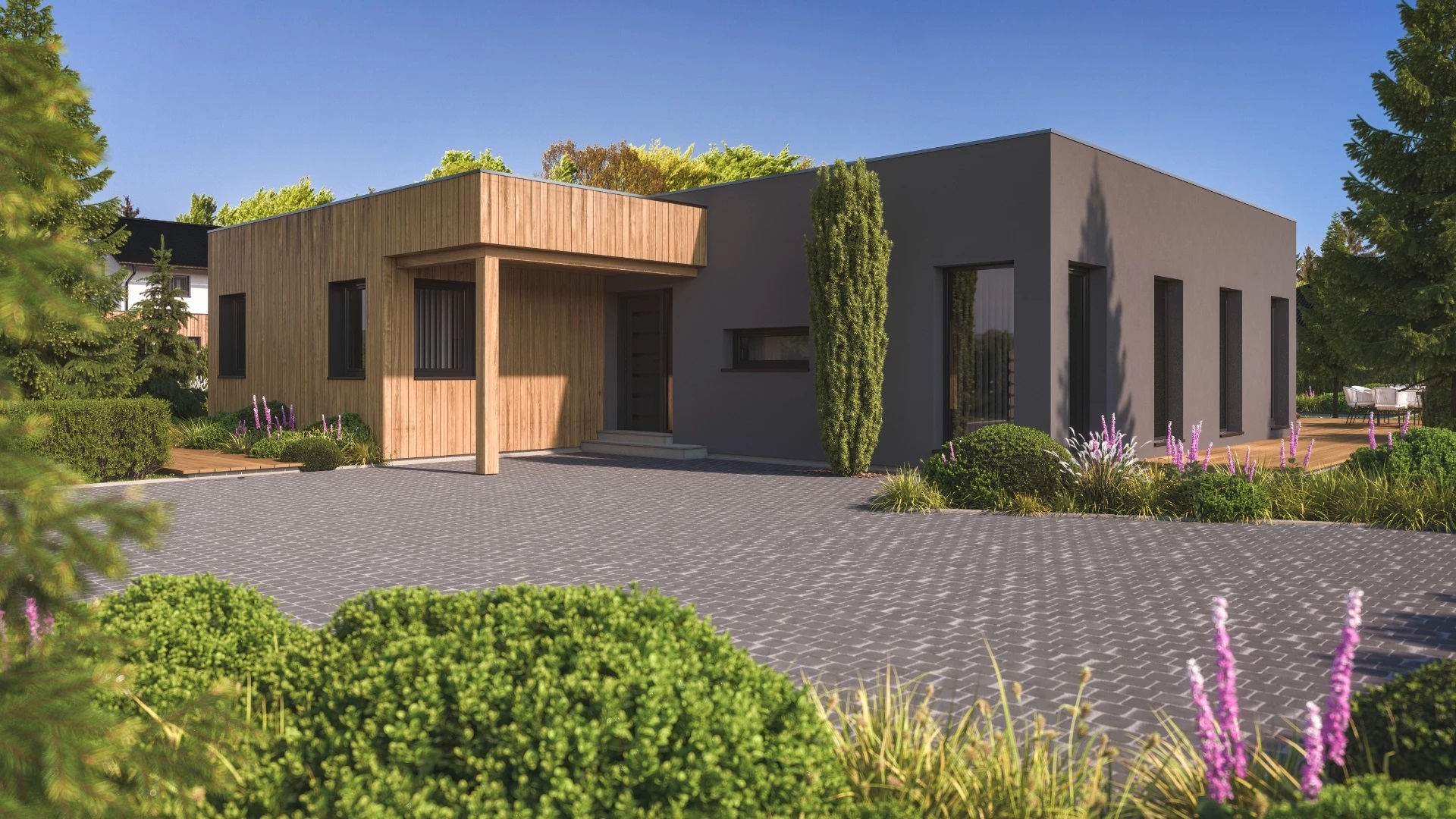 Moderní, prostorný bungalov s plochou střechou, ideální pro pohodlné bydlení větší rodiny. Praktickým prvkem domu je terasa a vstup, které jsou kryté přesahem střechy. Dřevěný obklad na fasádě dodává domu moderní vzhled a odkazuje na soulad s přírodou.