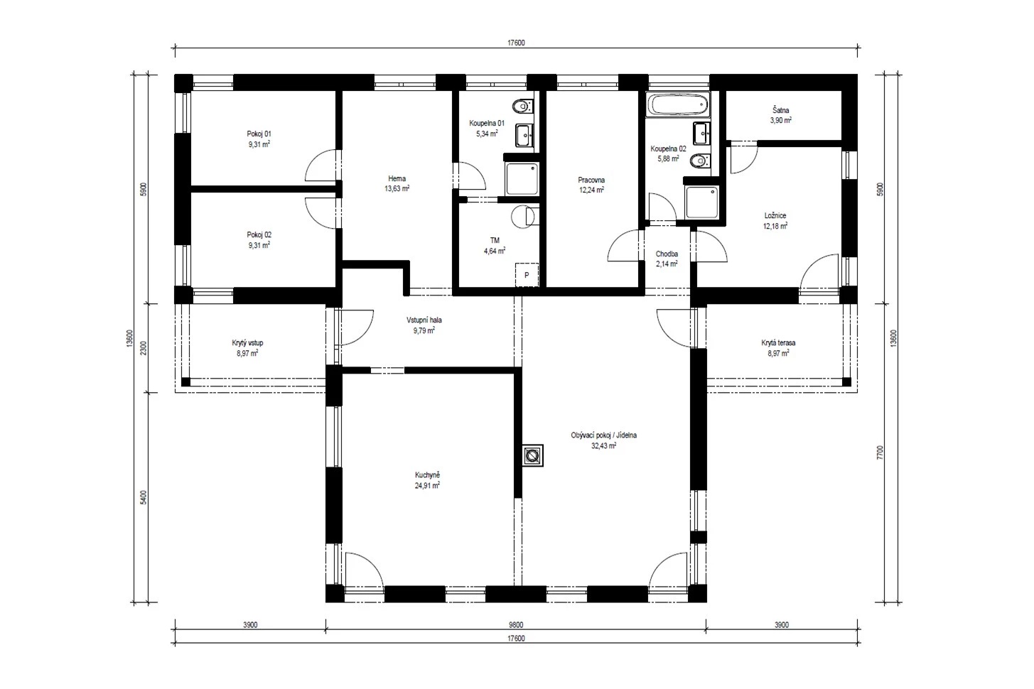 Cena včetně DPH. Cena dále zahrnuje komínový systém, tepelné čerpadlo, podlahové vytápění, centrální rekuperaci vzduchu, dřevěná nebo plasthliníková okna.