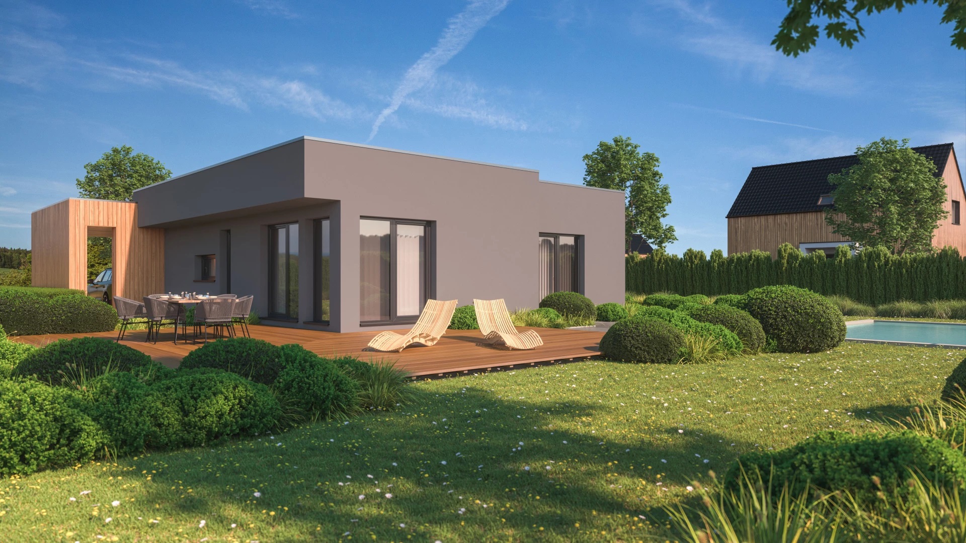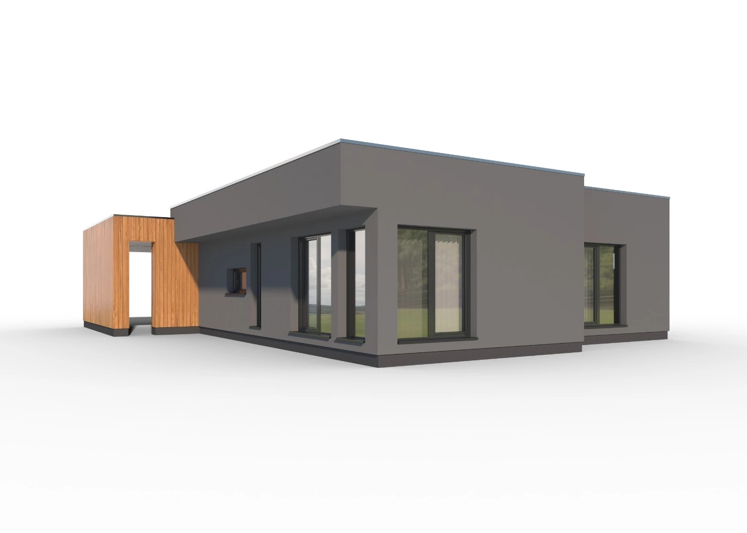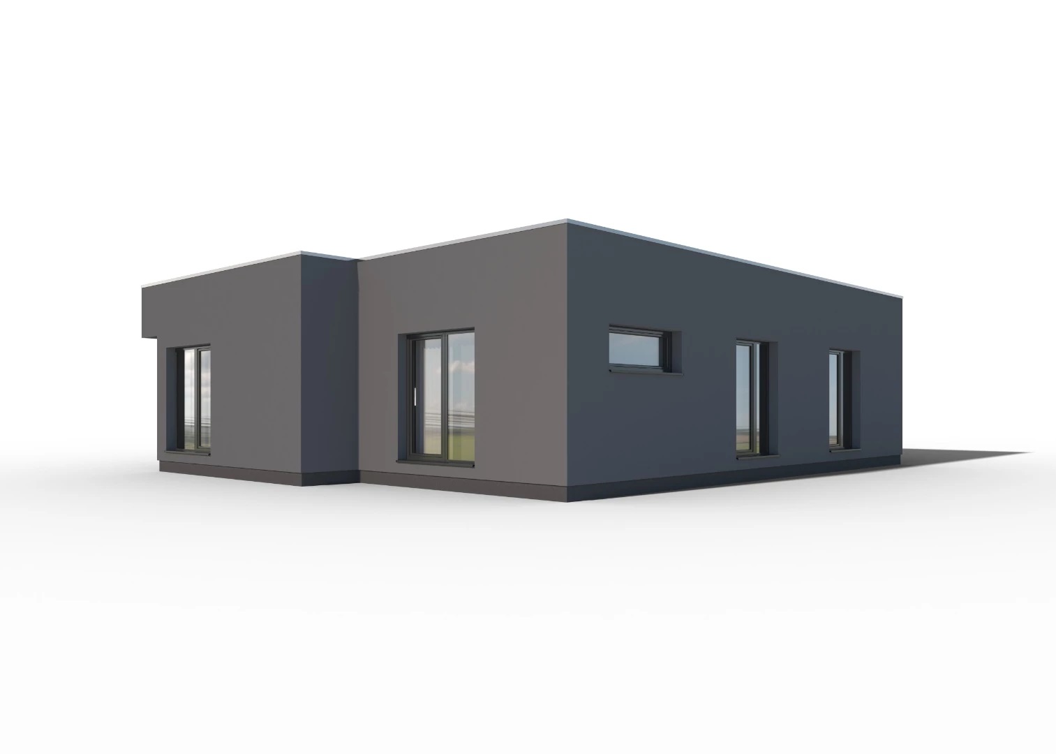 Moderní, 4pokojový bungalov s plochou střechou a jednoduchými, elegantními liniemi. Součástí domu je krytý vstup s parkovacím stáním.