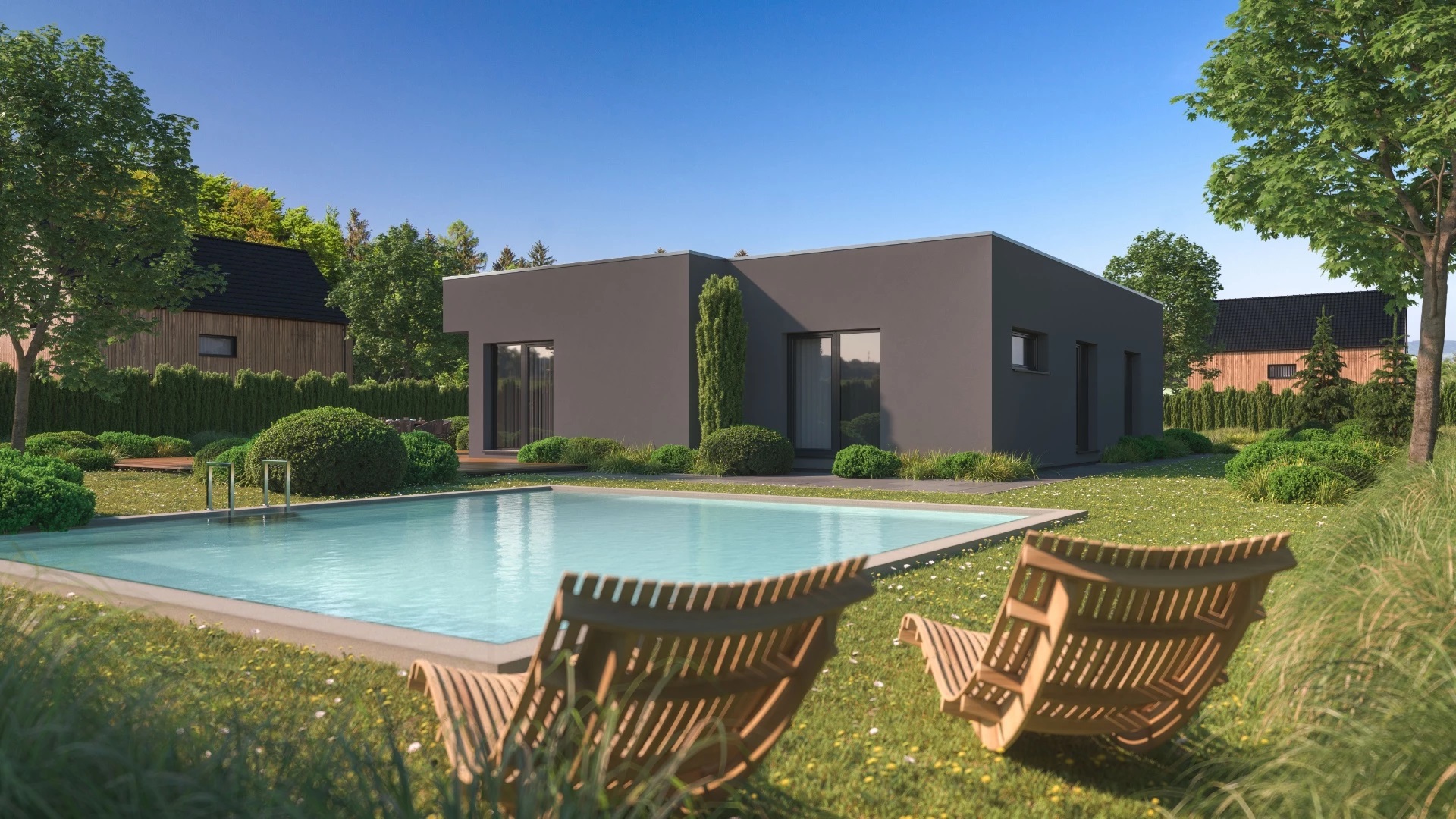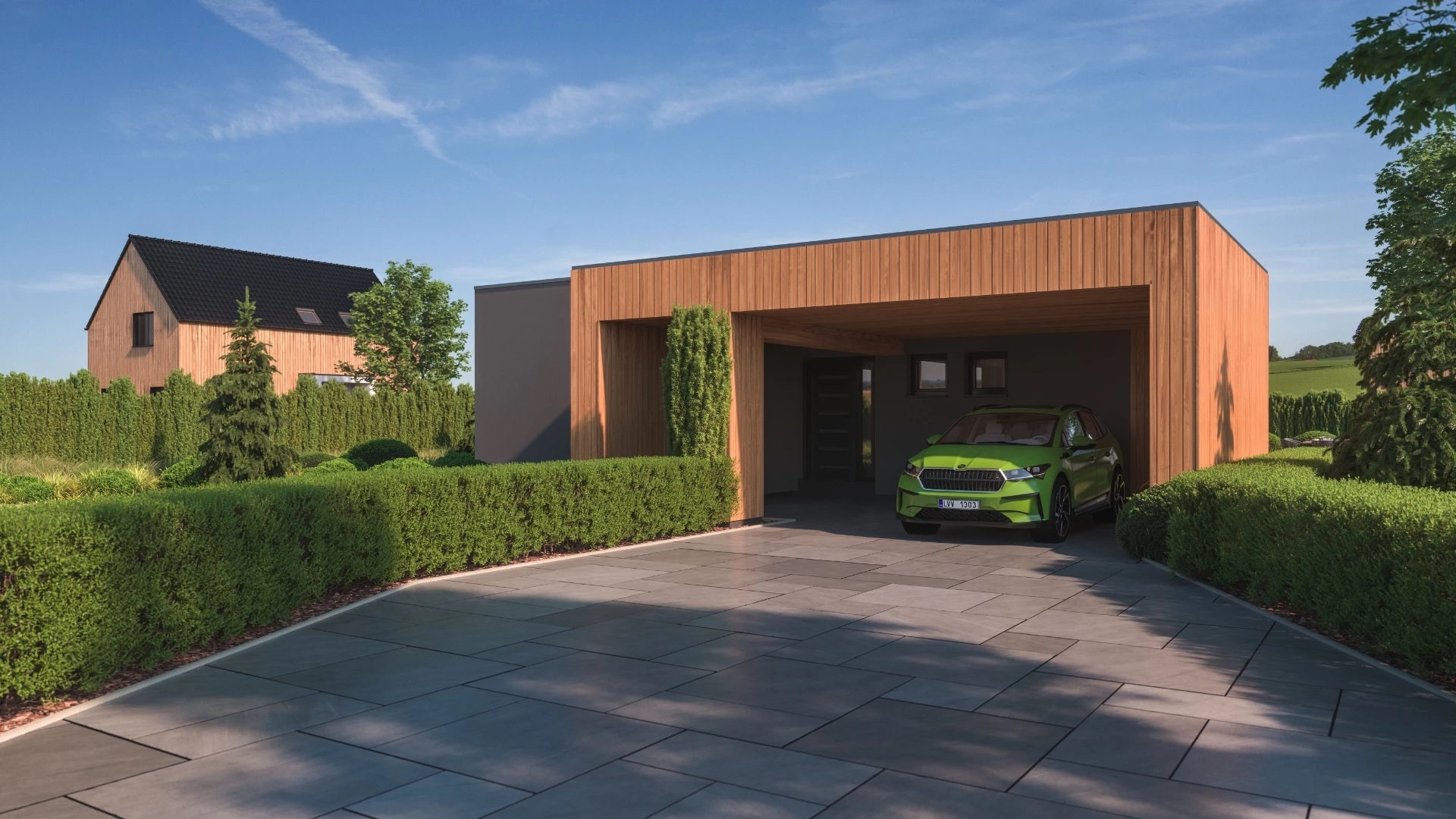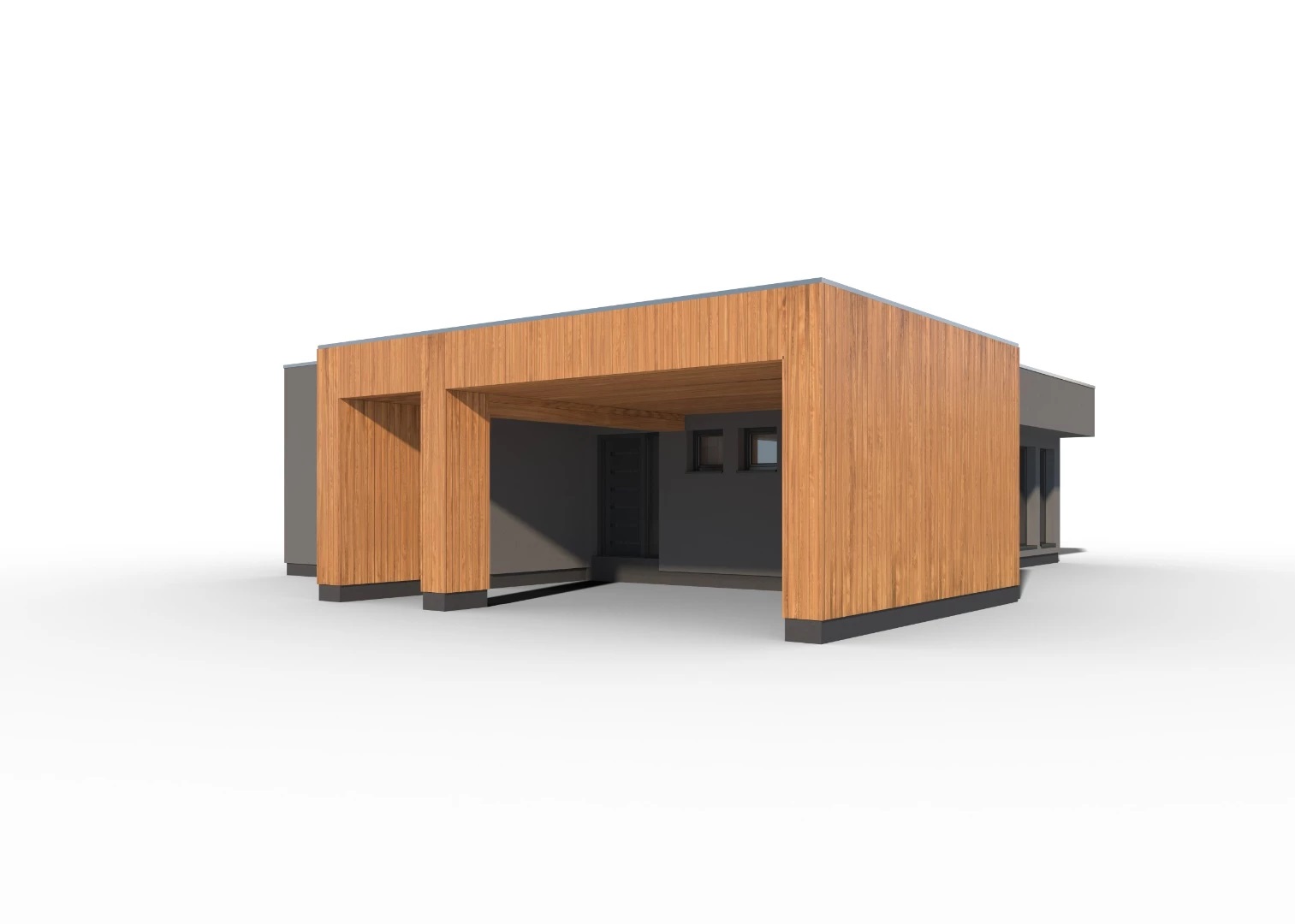 Moderní, 4pokojový bungalov s plochou střechou a jednoduchými, elegantními liniemi. Součástí domu je krytý vstup s parkovacím stáním.