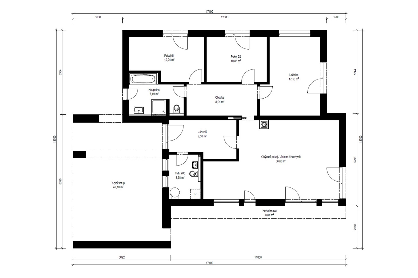 Ve všech pokojích a v zádveří je navržen prostor pro vestavěné skříně.