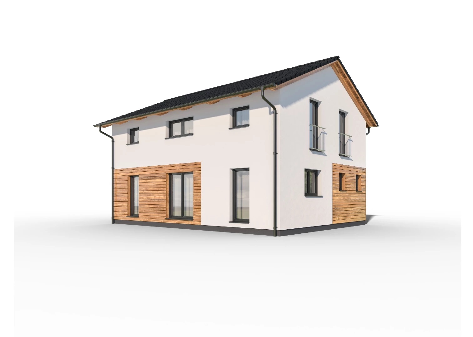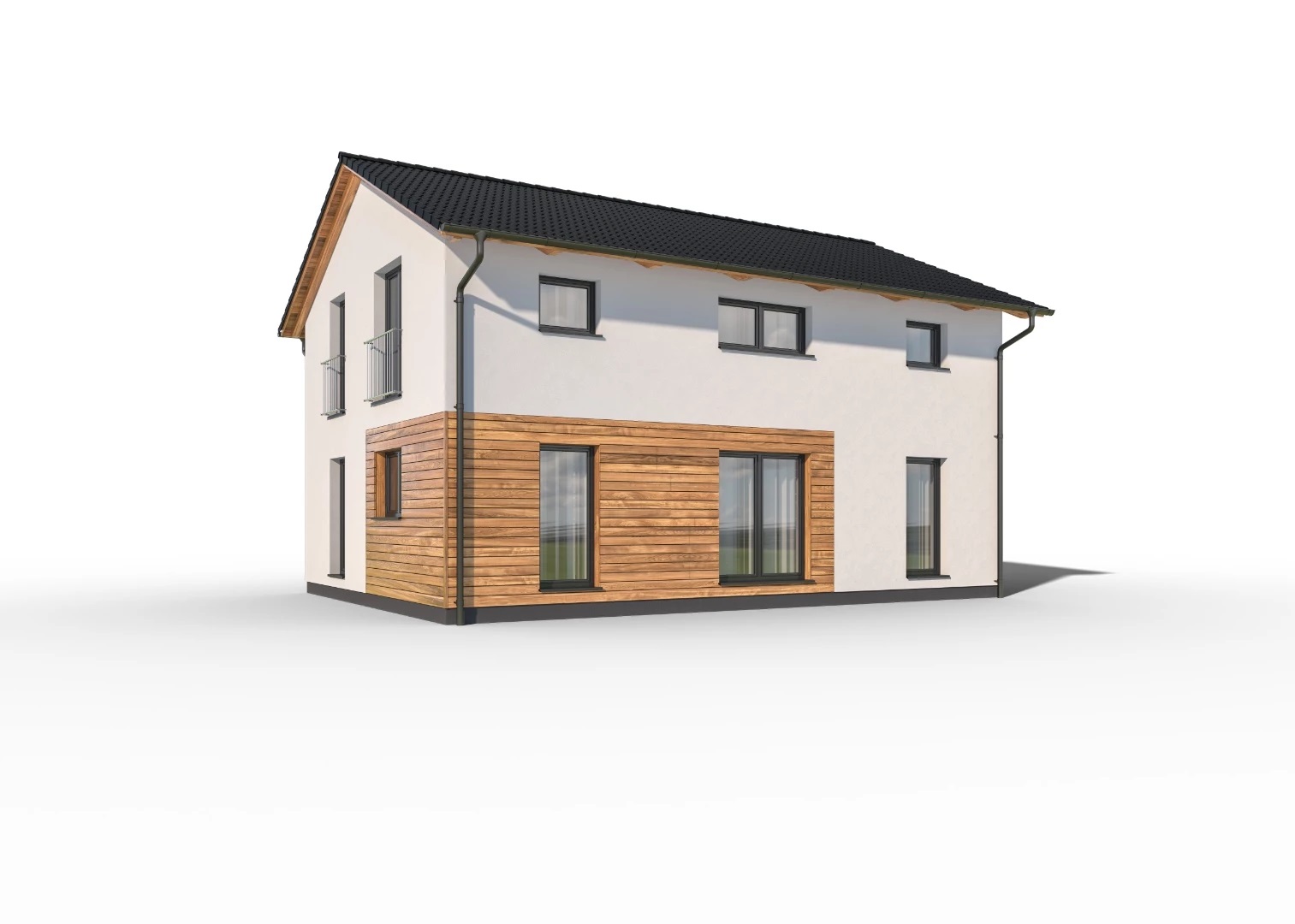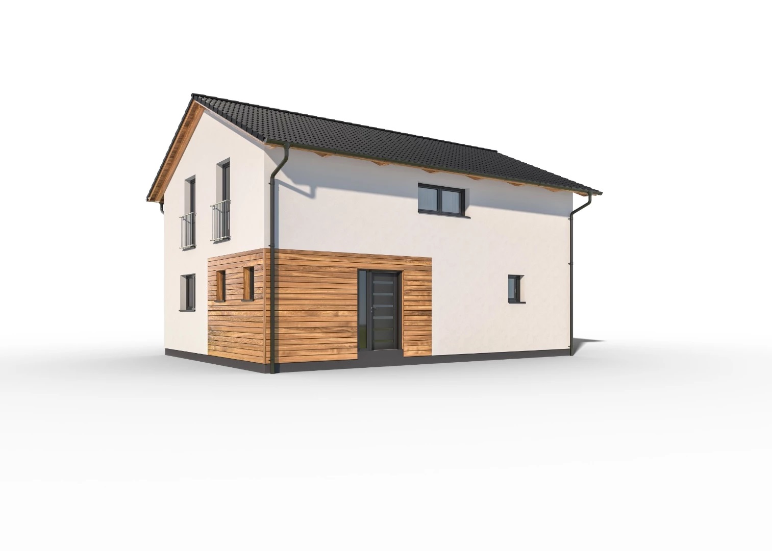 Prostorný, dvoupodlažní rodinný dům se sedlovou střechou, ideální pro pohodlné bydlení větší rodiny. Dřevěný obklad na části fasády dodává domu moderní vzhled.