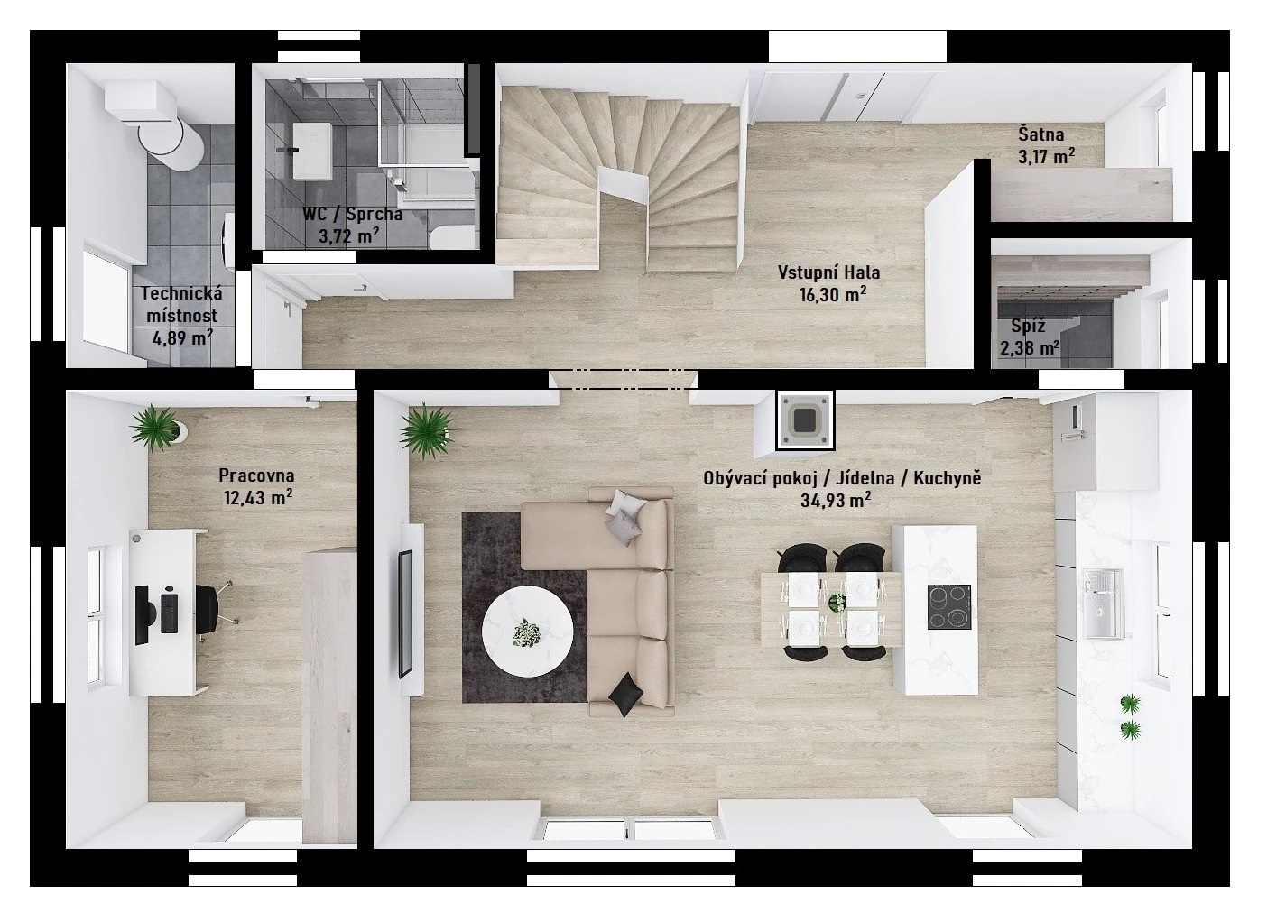 V přízemí je umístěn velkorysý obytný prostor, propojený s jídelnou a kuchyňským koutem, kde je navržen varný ostrůvek. Nechybí ani spíž pro pohodlné skladování potravin. Francouzská okna interiér přirozeně propojují s terasou a zajišťují dostatek denního světla.