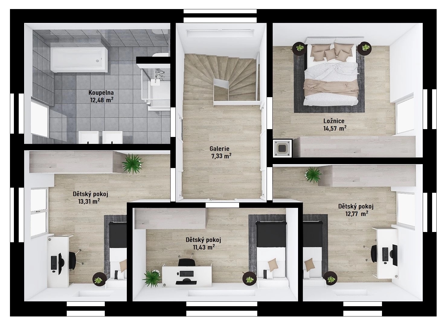 V patře je umístěna ložnice rodičů, 3 dětské pokoje a nadstandardně velká koupelna s vanou i sprchovým koutem.