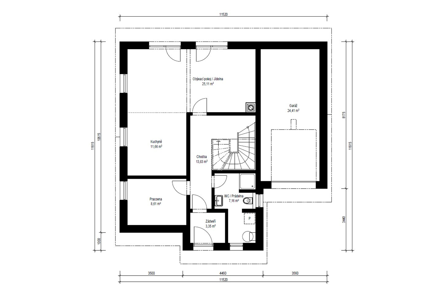 V přízemí najdeme obývací prostor, propojený s jídelnou a kuchyňským koutem. Pro vytvoření útulné atmosféry je zde navržen krb. Dostatečné prosvětlení místnosti a propojení s exteriérem domu zajišťují velká francouzská okna.