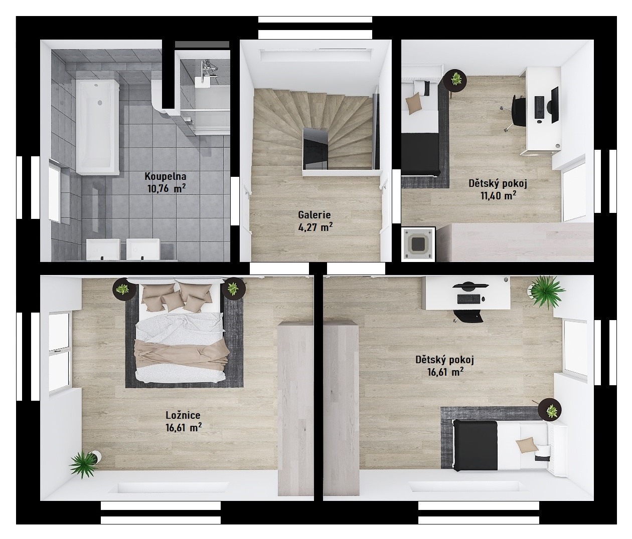 V patře je umístěna prostorná ložnice rodičů, 2 dětské pokoje a nadstandardně velká koupelna s vanou a sprchovým koutem.