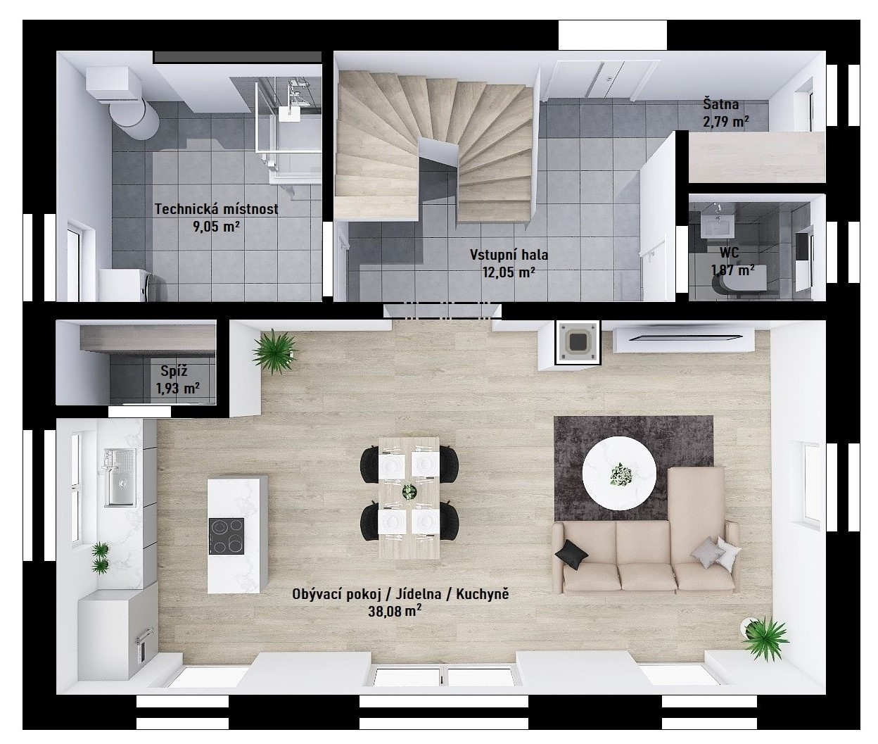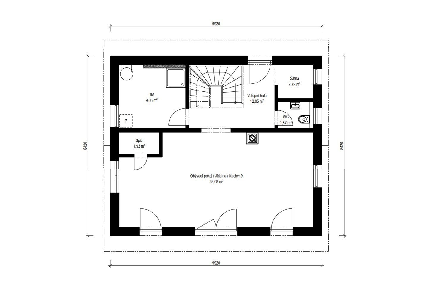 V přízemí najdeme obytný velkoprostor s krbem, propojený s jídelnou a kuchyňským koutem, kde je navržen varný ostrůvek. Praktickým prvkem kuchyně je spíž pro pohodlné skladování potravin. Prosvětlení interiéru denním světlem a přirozené propojení s terasou zajišťují velká francouzská okna.
