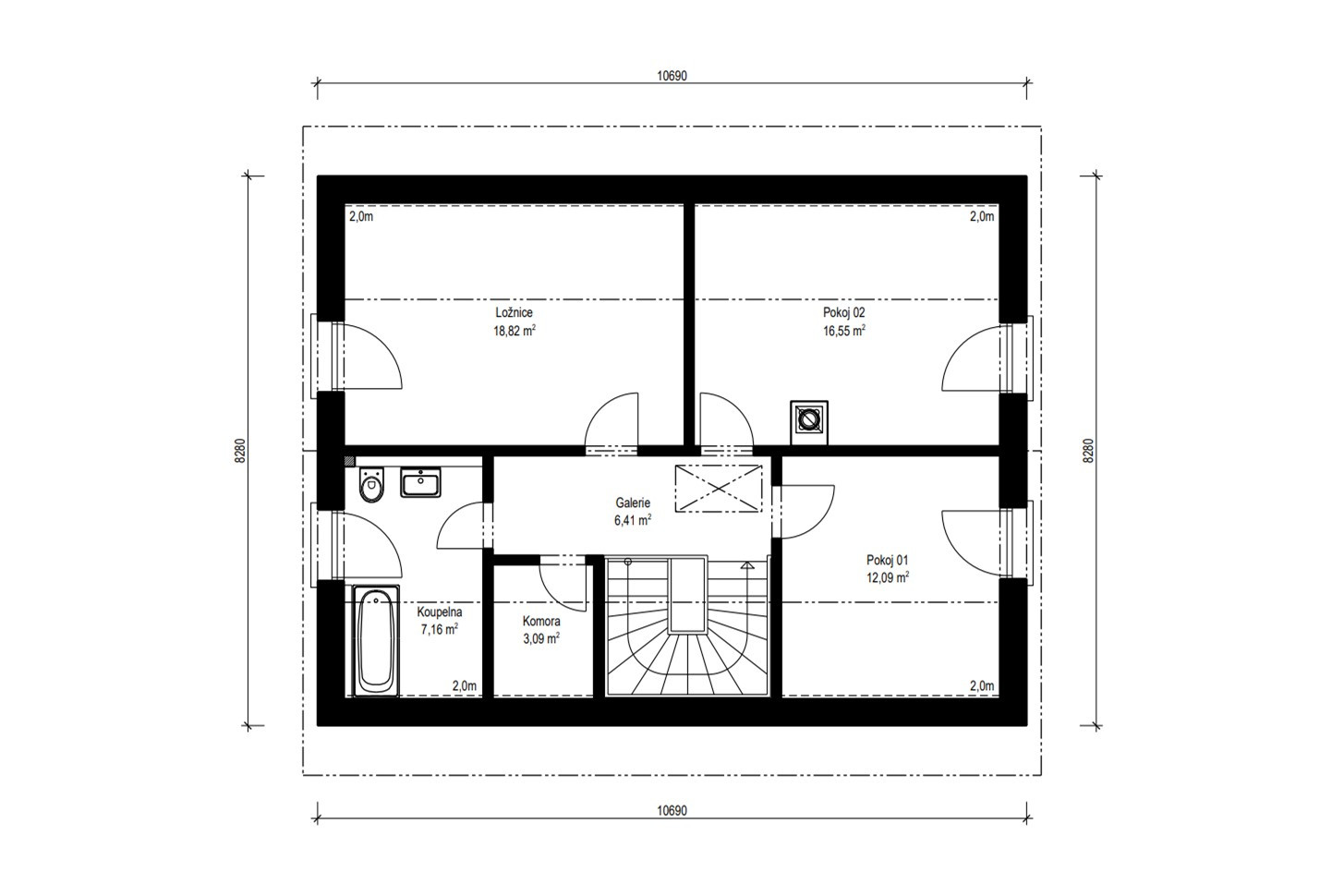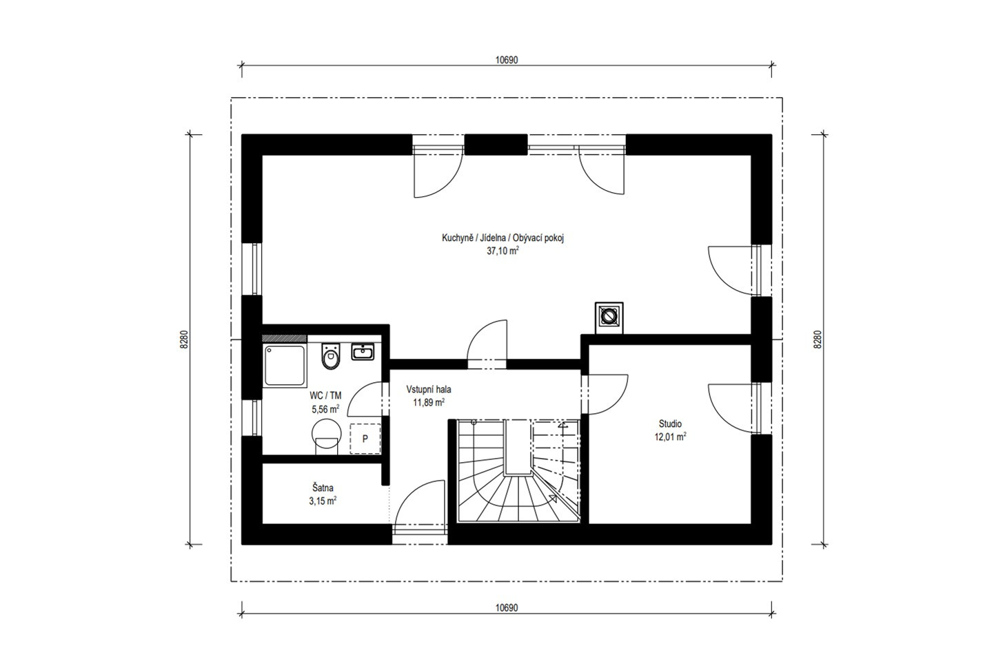 Cena včetně DPH. Cena dále zahrnuje komínový systém, tepelné čerpadlo, podlahové vytápění, centrální rekuperaci vzduchu, dřevěná nebo plasthliníková okna.