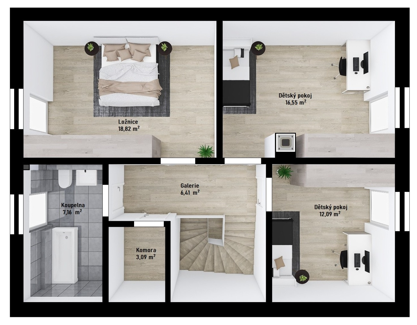 V patře domu je umístěna velkorysá ložnice rodičů, 2 dětské pokoje a koupelna. Z chodby je přístupná komora, která může sloužit jako šatna.