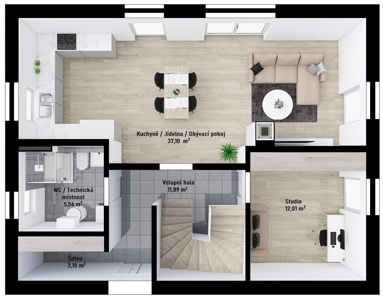 Dům k dokončení neobsahuje finální povrchy podlah a stěn (obklady, dlažby, podlahové krytiny, výmalba), zařizovací předměty koupelen a wc, interiérové dveře a zárubně, krbová kamna nebo krbovou vložku.