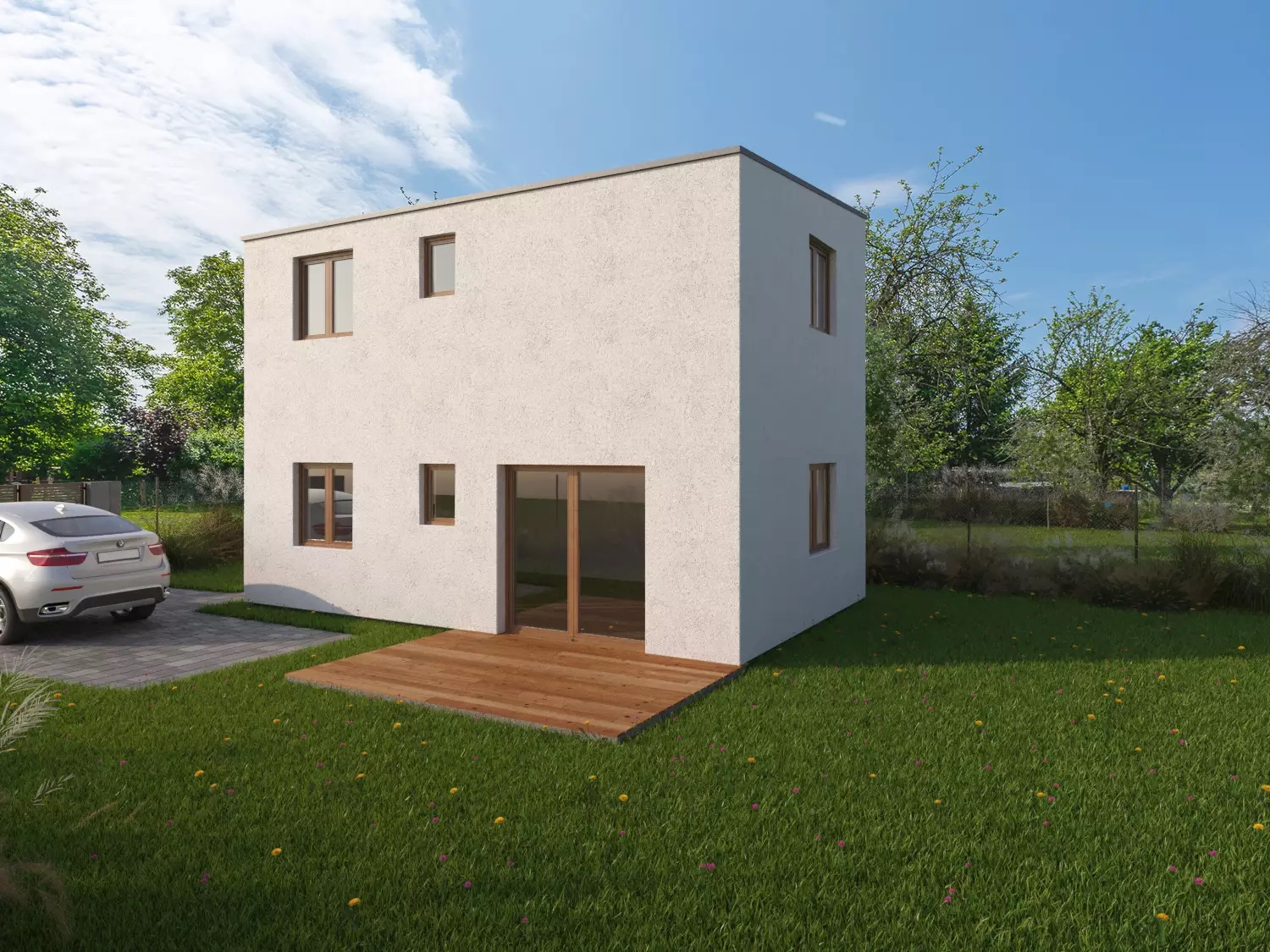 Jednoduchý, 3pokojový dvoupodlažní rodinný dům s plochou střechou a malou zastavěnou plochou. Je vhodný také pro rekreační bydlení. Dům splňuje podmínky pro chatové a jiné oblasti s omezenou zastavěností do 40 m2.