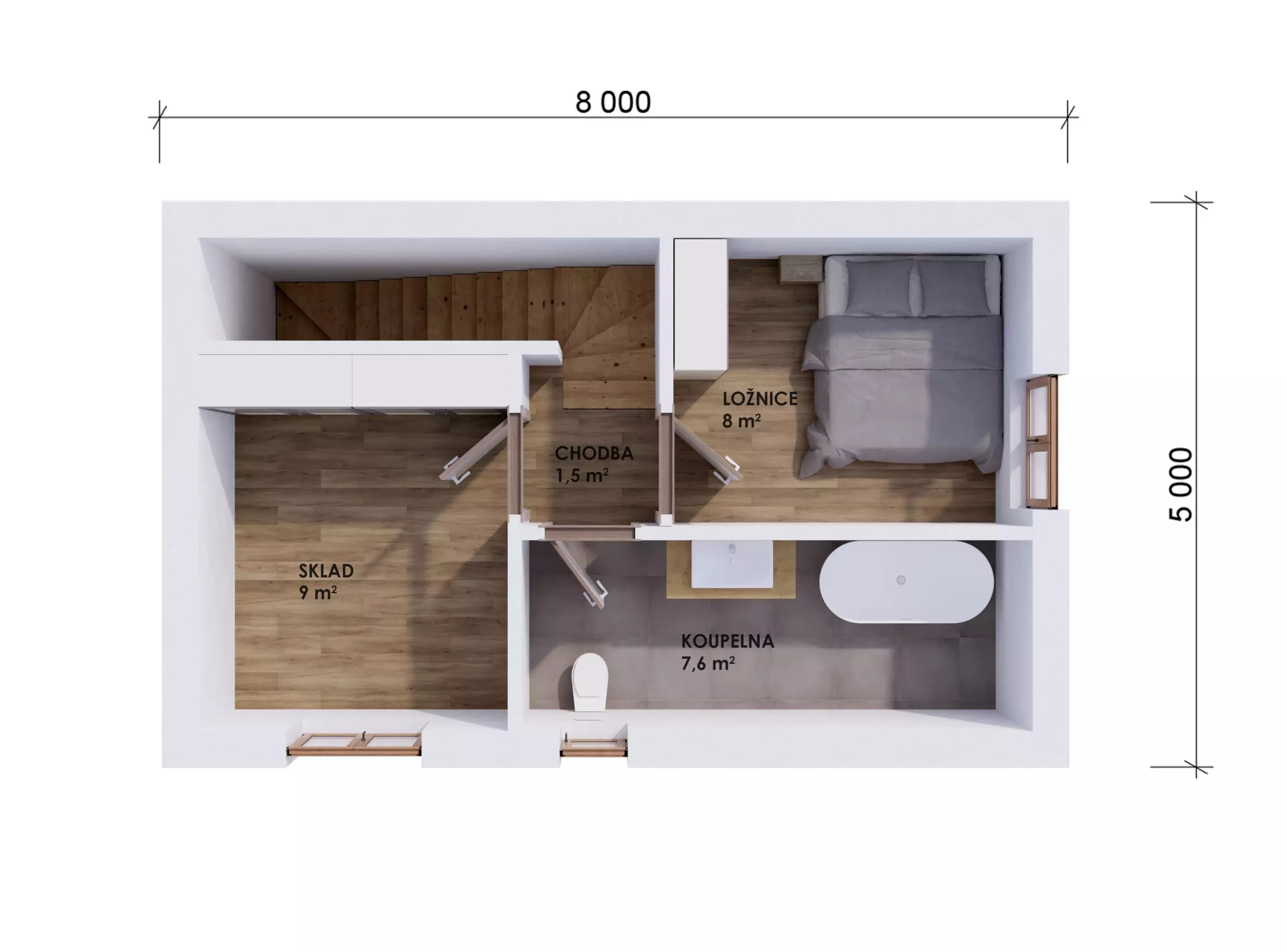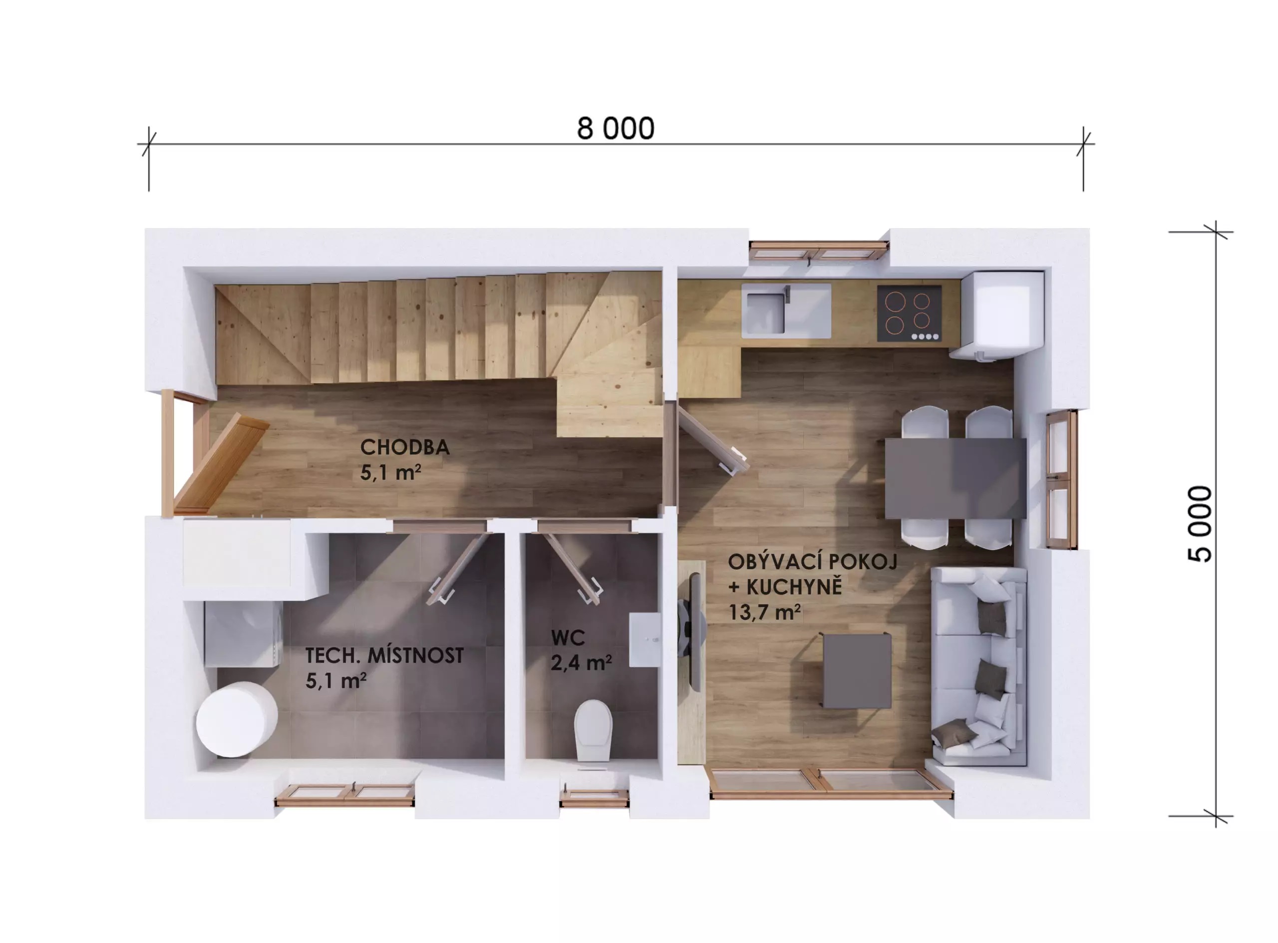 V přízemí dále najdeme samostatnou toaletu a technickou místnost.