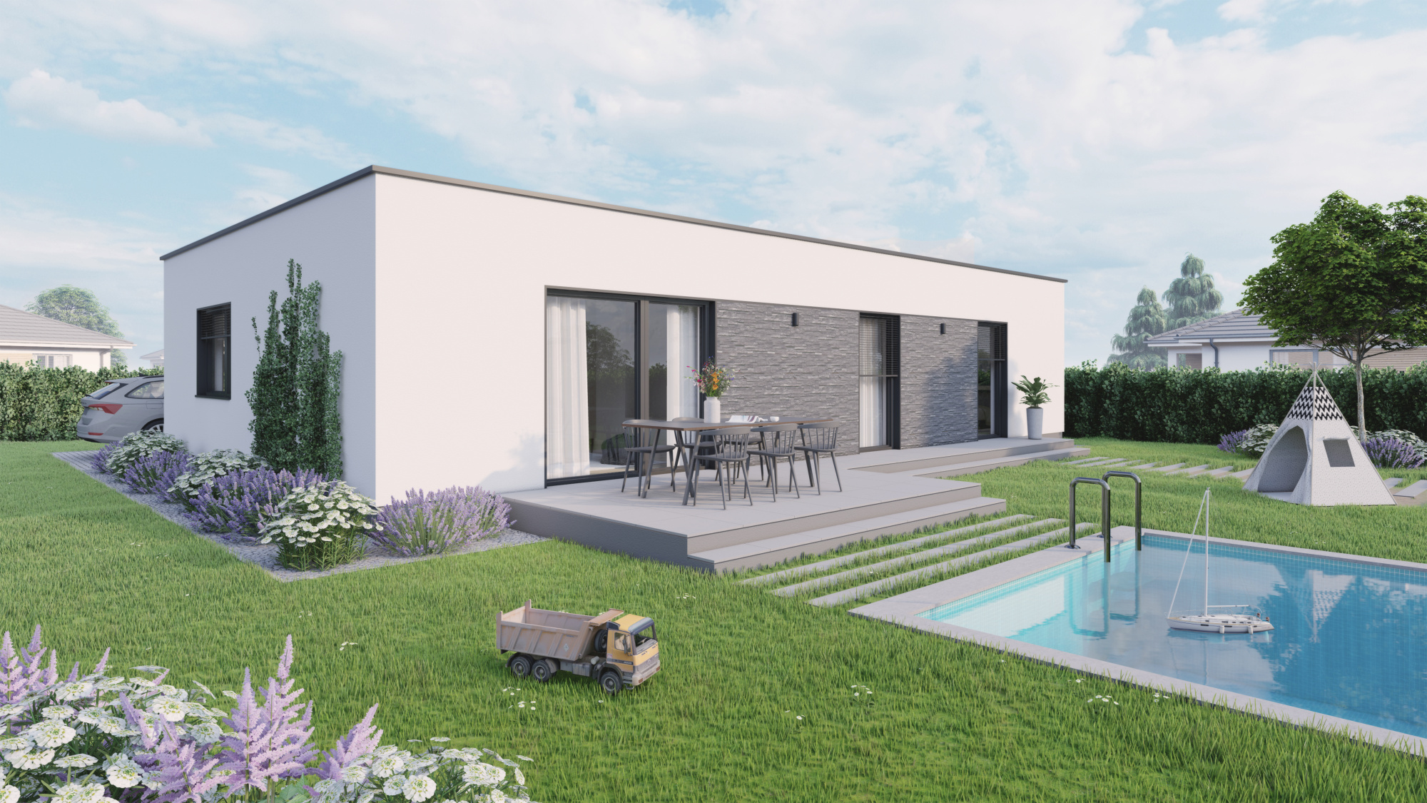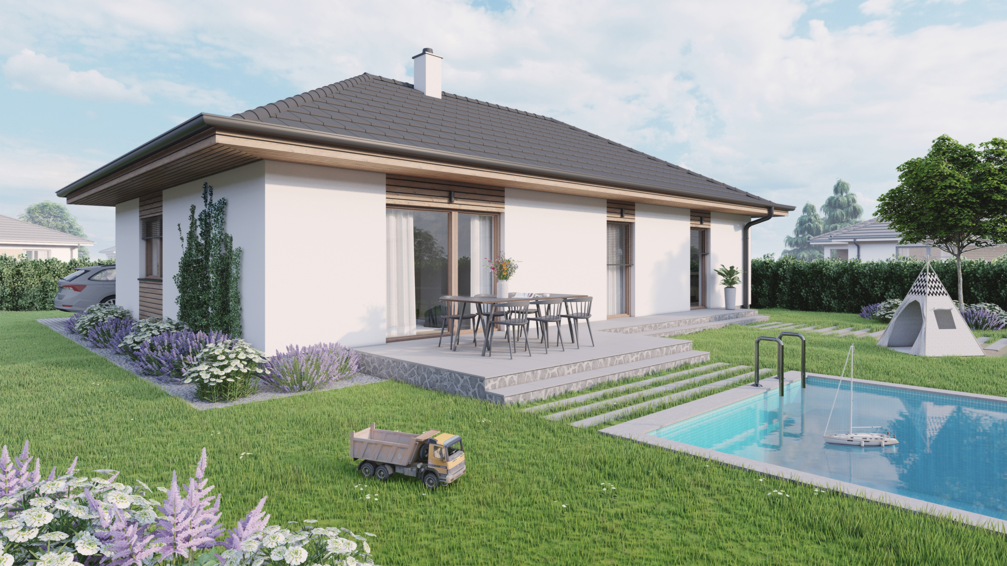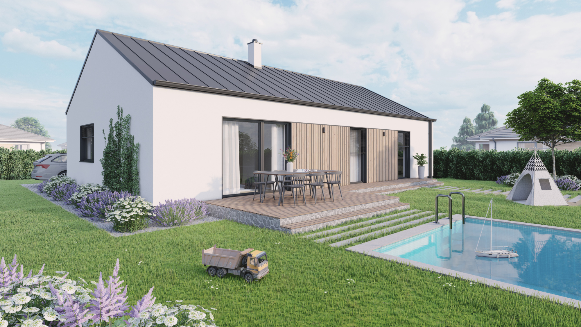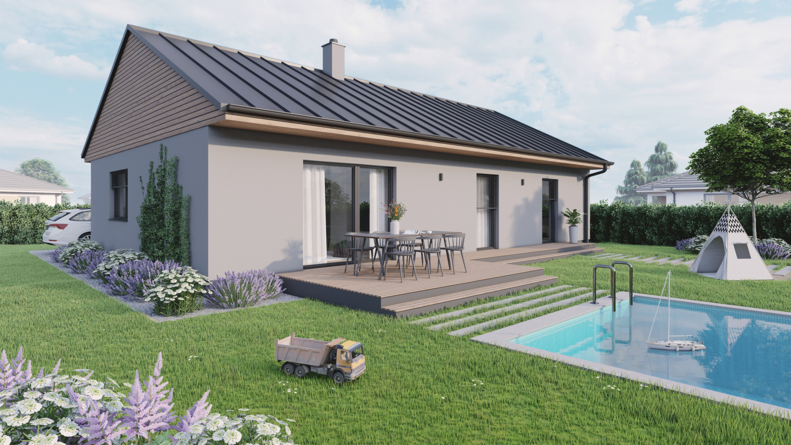 Moderní, jednoduchý 4pokojový bungalov s efektivně využitým půdorysem. Dům je ideální pro pohodlné bydlení rodiny se 2 dětmi. Fasádu domu lze oživit dřevěným obkladem.