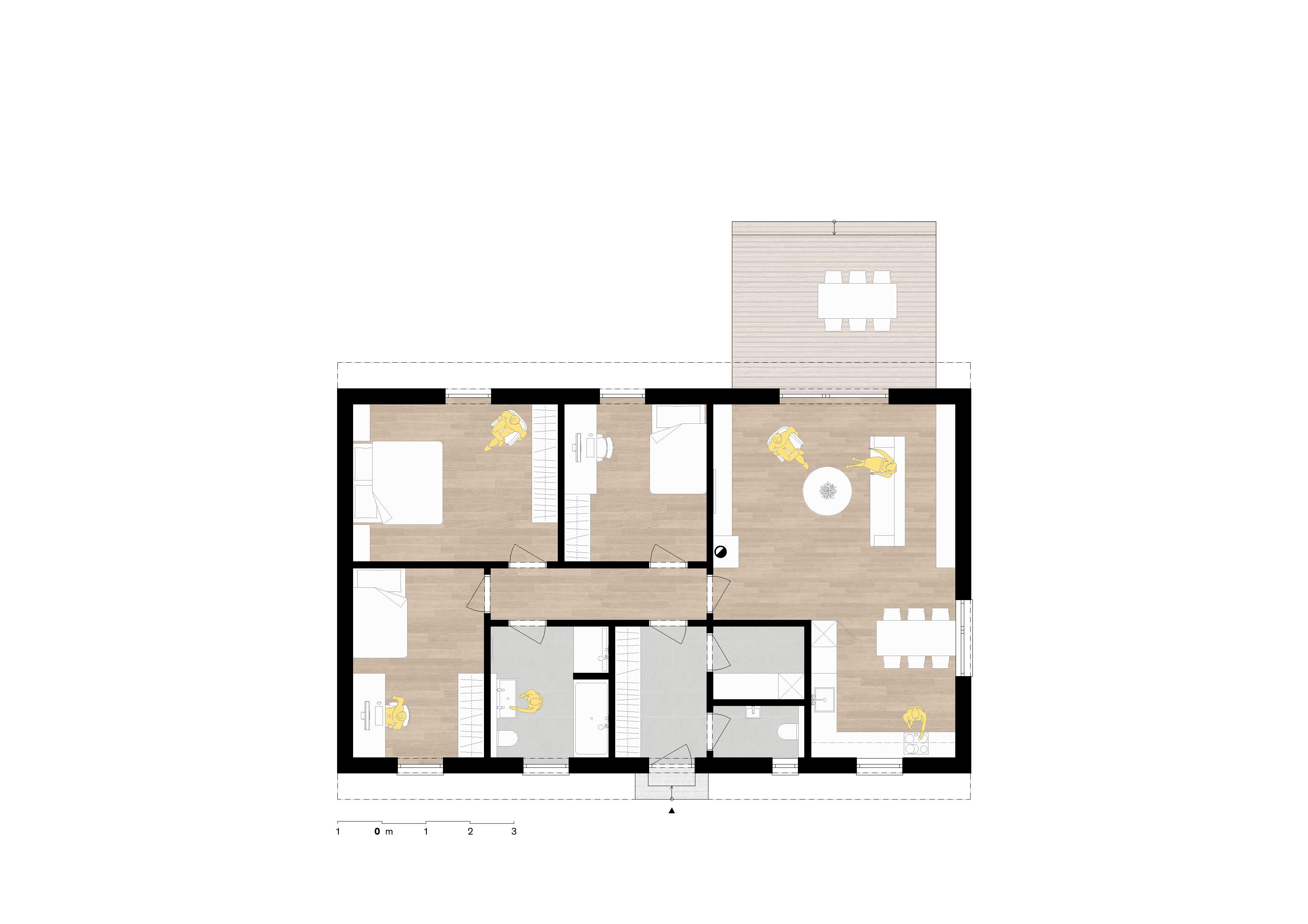 V privátní části najdeme ložnici rodičů a 2 dětské pokoje. Z ložnice a jednoho z pokojů je přímý výstup na terasu. Ve všech místnostech a v zádveří je navržen prostor pro vestavěné skříně. Nadstandardně velká koupelna nabízí vanu i sprchový kout.