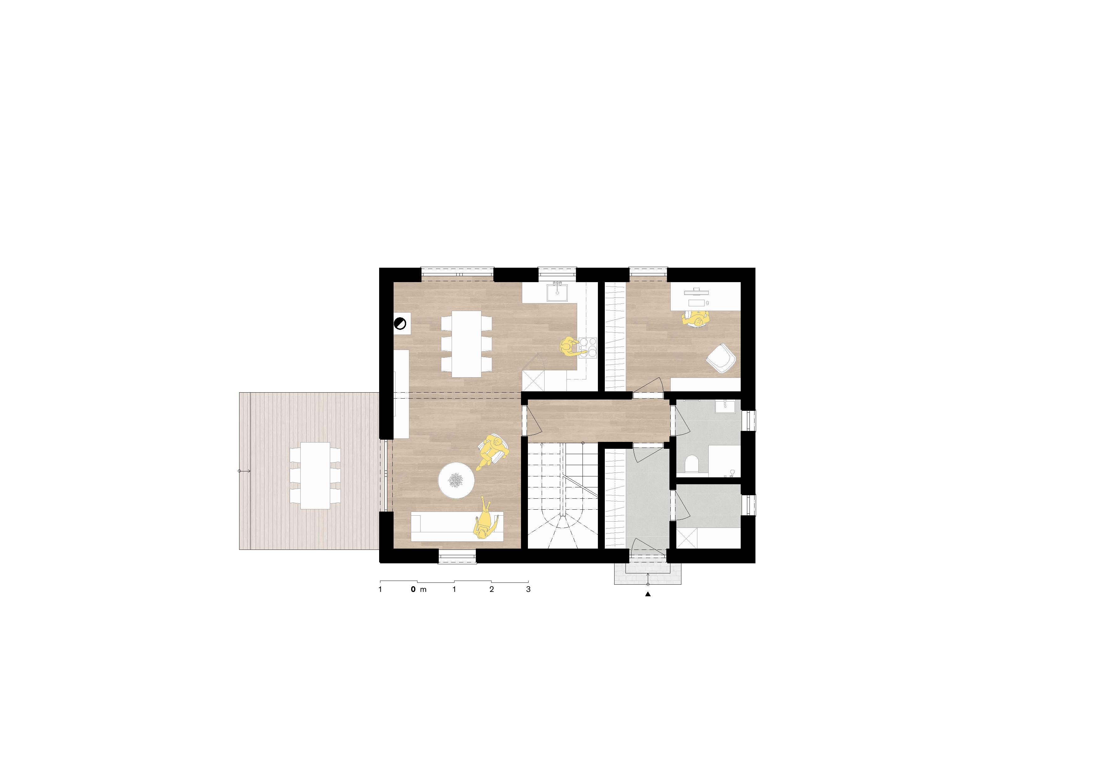 V přízemí se nachází obývací prostor, propojený s jídelnou a kuchyňským koutem. Bohaté prosklení zaručuje dostatek denního světla v interiéru a ničím nerušený výhled do zahrady. Nechybí ani krb.