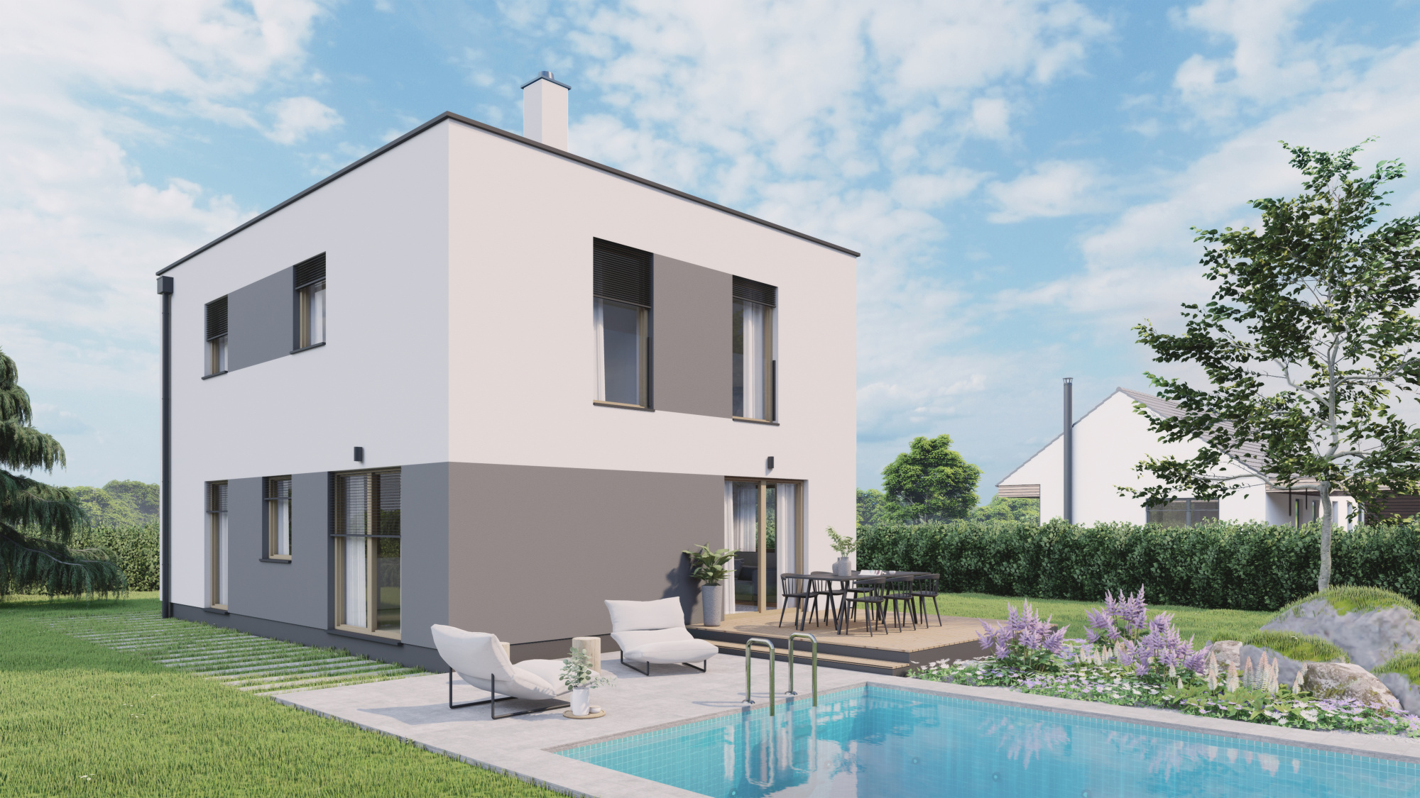 Cena včetně DPH. Cena dále zahrnuje projektovou dokumentaci, komínový systém, bleskosvod, tepelné čerpadlo.