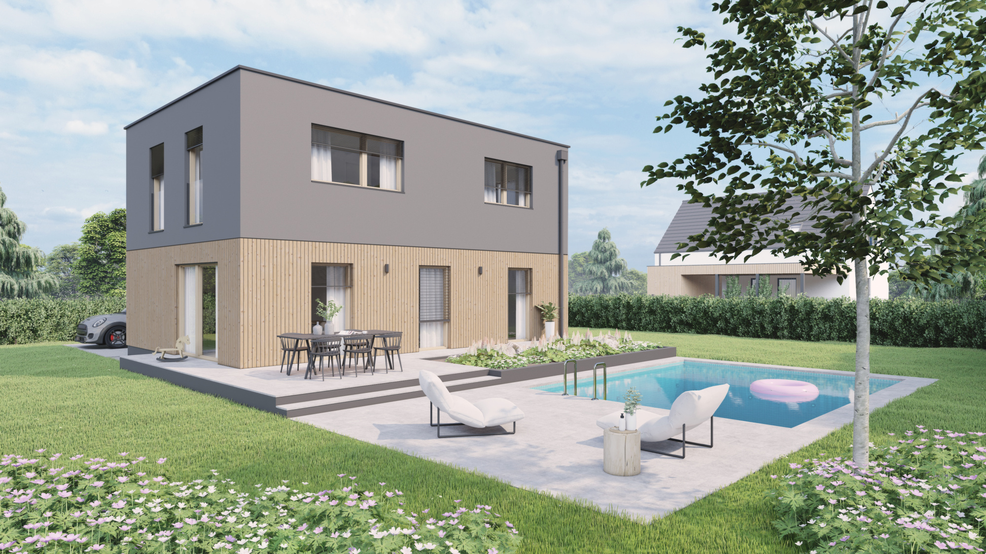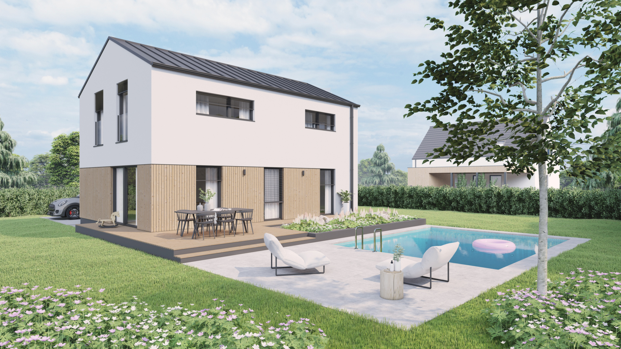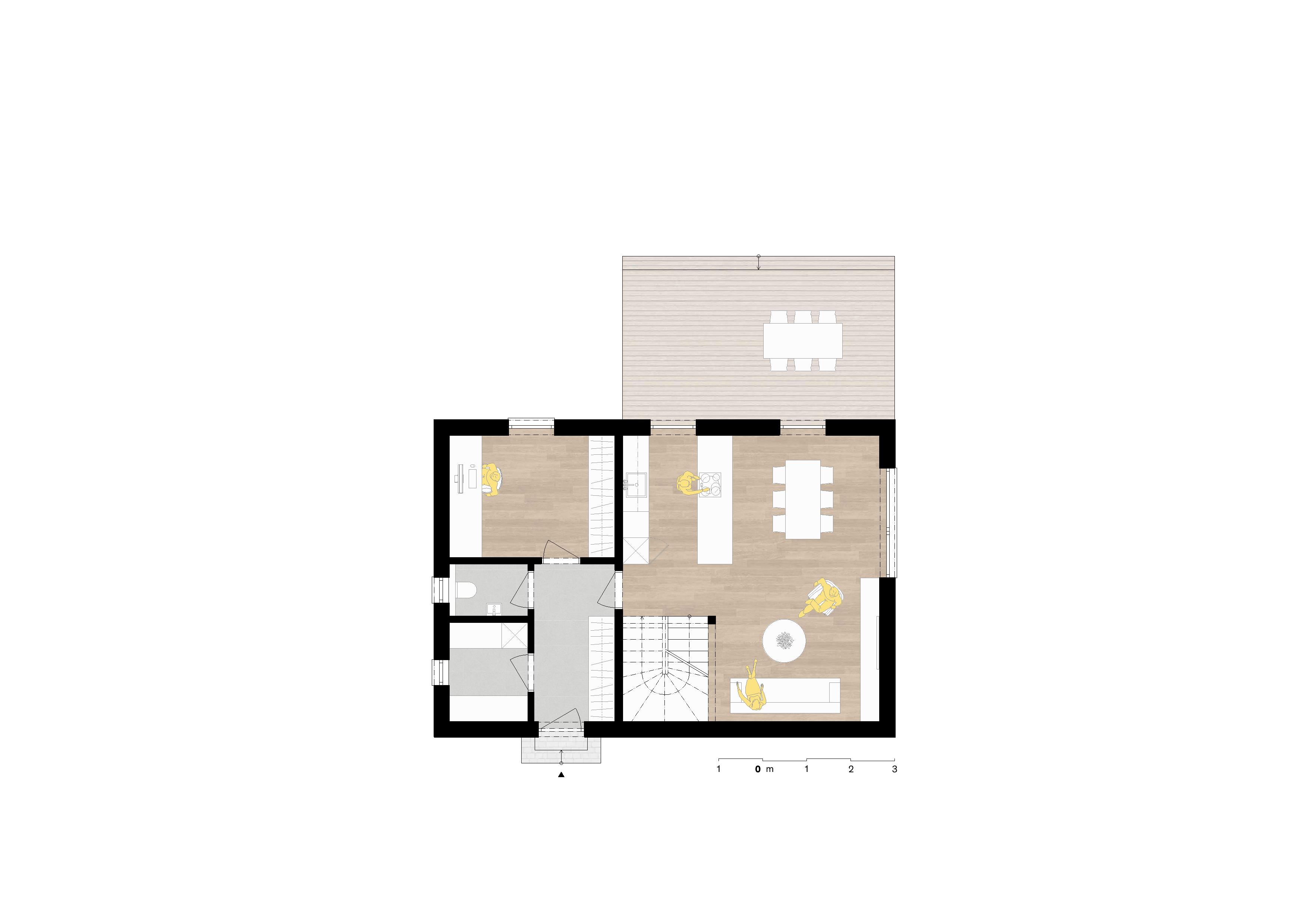 V přízemí se nachází obývací prostor, propojený s jídelnou a kuchyňským koutem. Francouzská okna jsou zárukou dokonalého prosvětlení interiéru a ničím nerušeného výhledu do zahrady.