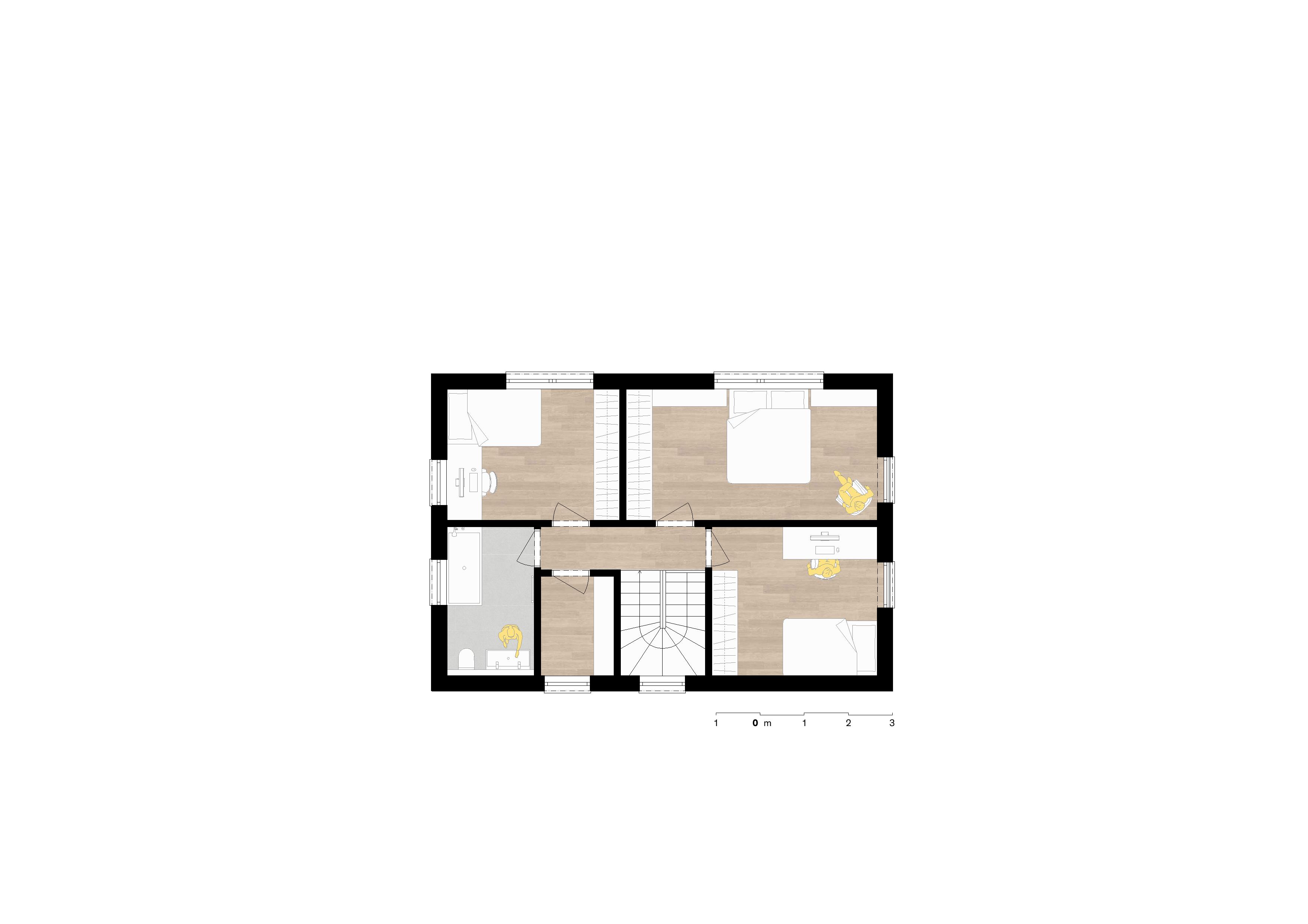 V patře najdeme velkorysou ložnici rodičů, 2 dětské pokoje, samostatnou šatnu a koupelnu s vanou. Ve všech pokojích a v zádveří je navržen prostor pro vestavěné skříně.