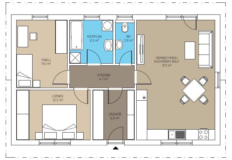 Srdcem domu je obytný prostor, propojený s jídelnou a kuchyňským koutem. Velké francouzské okno zajišťuje dokonalé prosvětlení interiéru a jeho přirozené propojení s terasou.