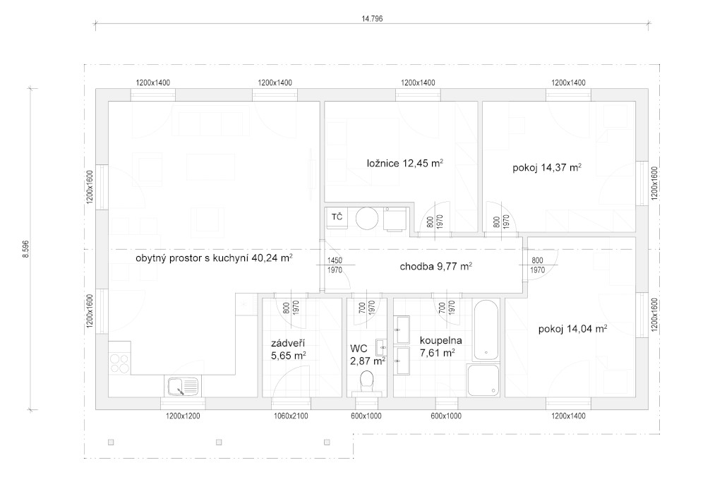 Dřevostavba má kuchyni propojenou s obývacím prostorem a dohromady tvoří společenskou část domu. Zatímco oddělená privátní část zahrnuje ložnici a 2 pokoje.