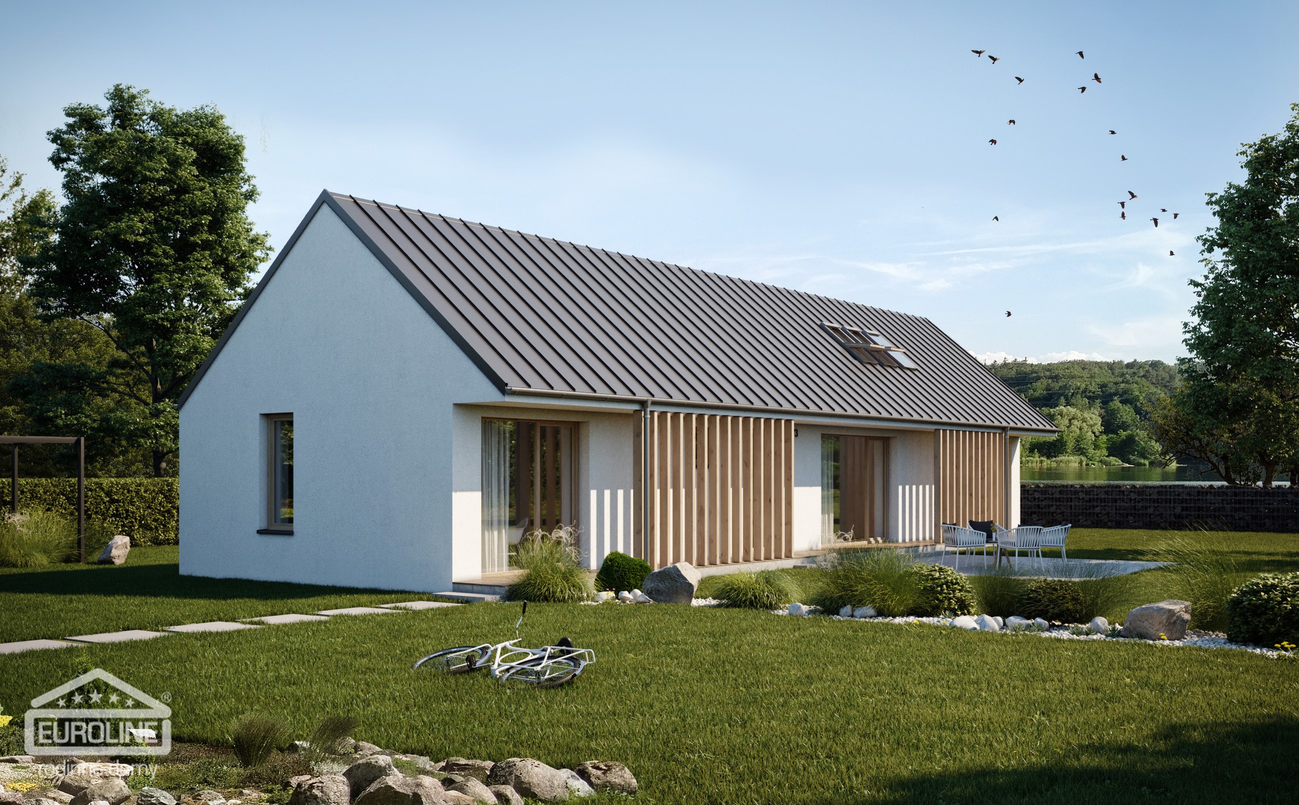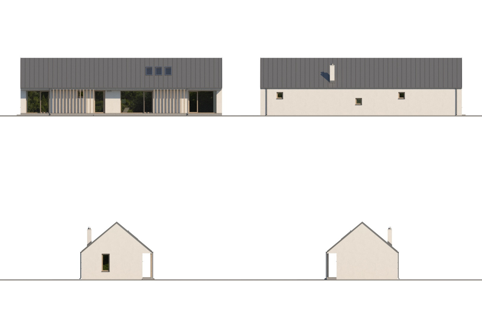 Kompaktní 4pokojový rodinný dům se sedlovou střechou a efektivně využitým půdorysem. Tento bungalov je ideální pro bydlení rodiny se 2 dětmi. Zajímavými architektonickými prvky jsou částečné překrytí terasy přesahem střechy a krytina z falcovaného plechu.