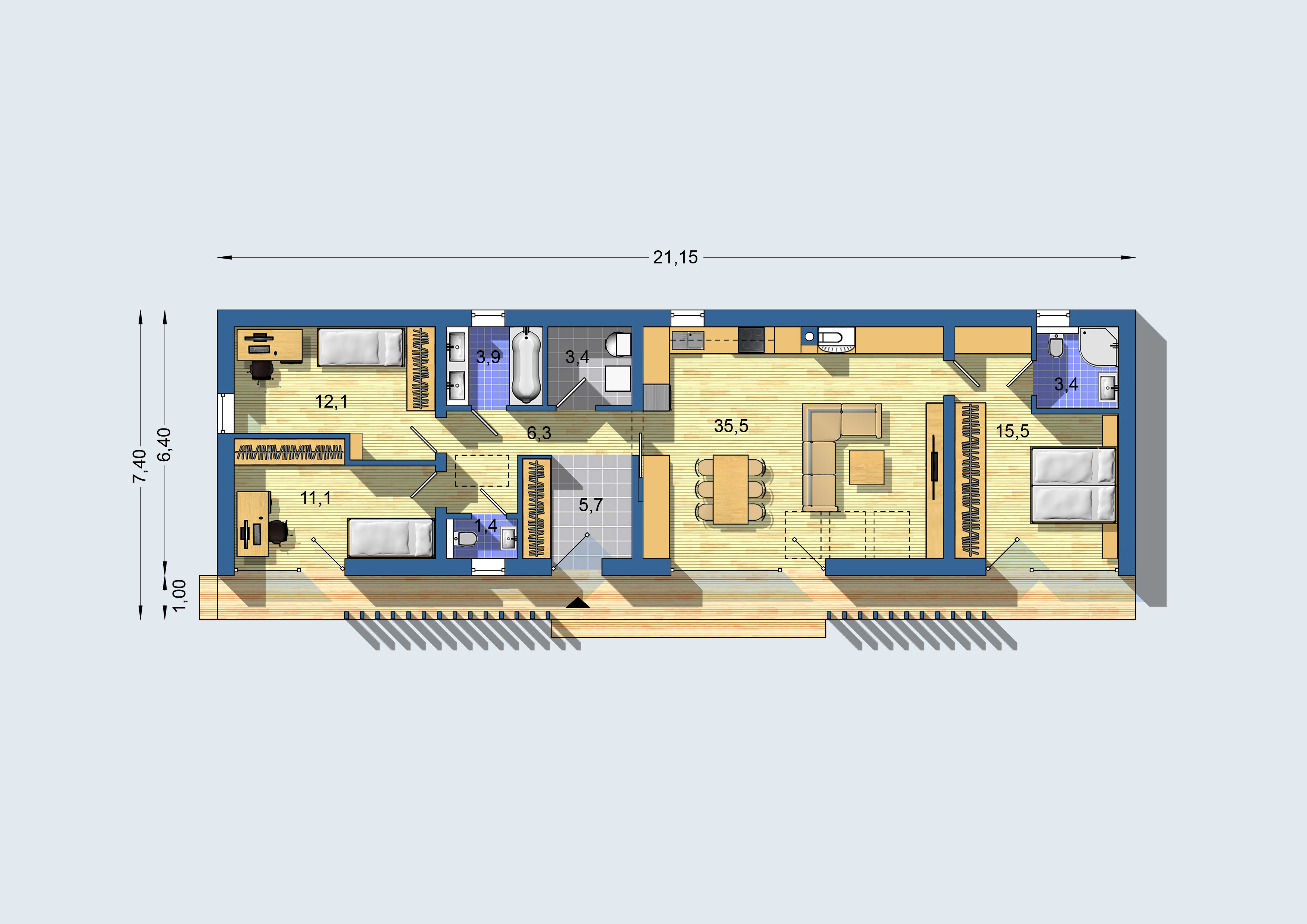 21,15 x 7,40 m
