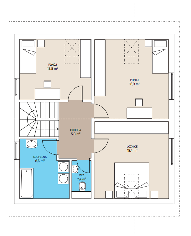 V patře je umístěna pohodlná ložnice rodičů, 2 velkorysé dětské pokoje a prostorná koupelna s vanou. Z chodby je přístupné samostatné WC.