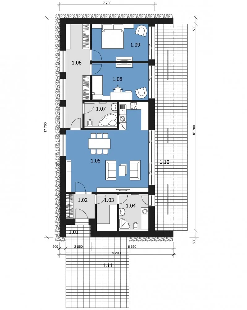 V privátní části je umístěna koupelna s vanou a 2 pohodlné ložnice s francouzskými okny. Chodba u ložnic je řešena v kombinaci se šatnou.