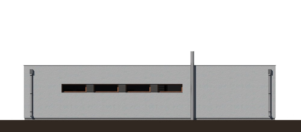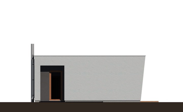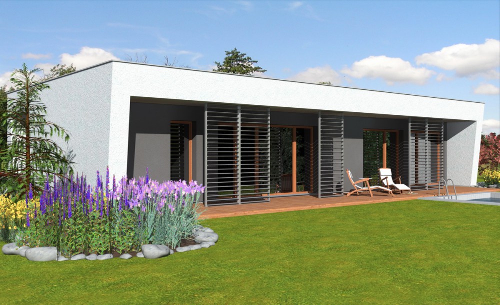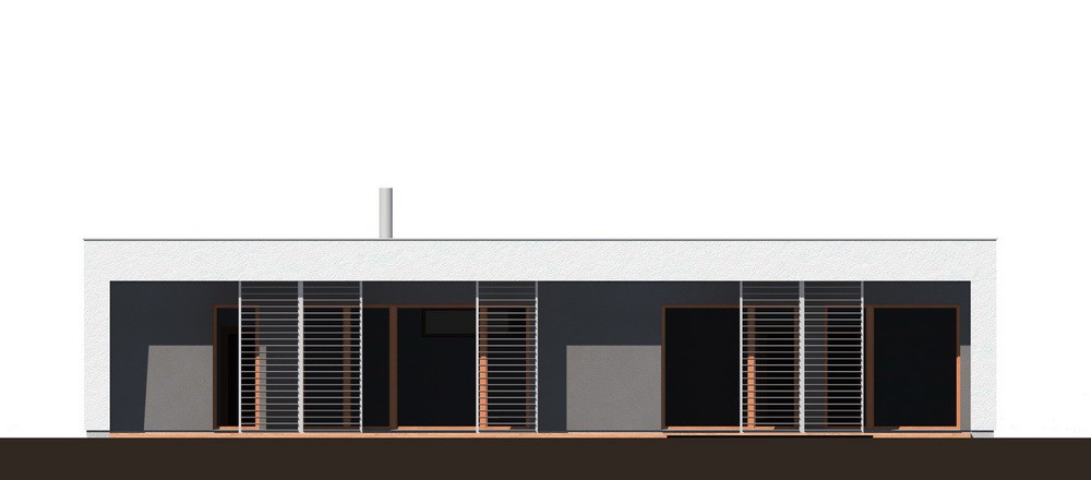 Moderní, kompaktní rodinný dům typu bungalov s plochou střechou a bohatým prosklením. Dominantním architektonickým prvkem je velká terasa při jedné straně domu, která je kryta přesahem hmoty domu a zastíněna posuvnými panely s lamelami. Všechny obytné místnosti mají výstup na terasu a jsou orientovány do zahrady.