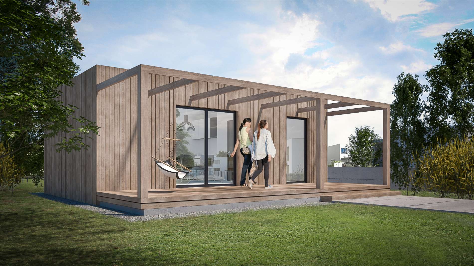 Moderní, kompaktní, minimalistický dům s plochou střechou. Dům je ideální jako rekreační objekt nebo ubytovací zařízení, ale může sloužit i k trvalému bydlení. Dřevěný obklad použitý na fasádě dodává domu atraktivní vzhled.
